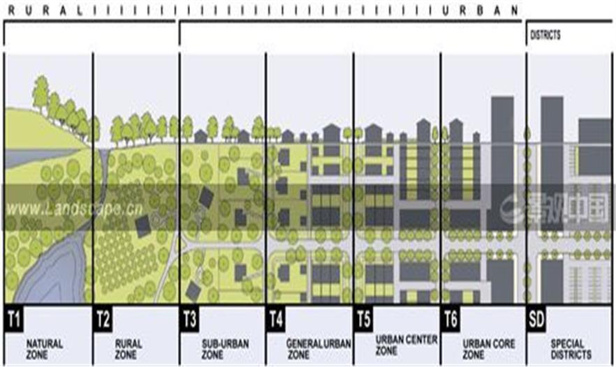 王曉川:這本書(shū)08年底在美國(guó)出版,是一本關(guān)于精明增長(zhǎng)、新都市主義的實(shí)踐手冊(cè)。大概在1996年的時(shí)候美國(guó)出臺(tái)了《新都市主義憲章》(Charter?of?New?Urbanism),其中就界定了整個(gè)新都市主義的主要原則。這一理論的主要背景就是在二戰(zhàn)以后的都市發(fā)展:快速城市化進(jìn)程,郊區(qū)蔓延,侵蝕了很多農(nóng)田、基本綠地、開(kāi)放空間等等現(xiàn)象,這種蔓延式的發(fā)展造成了不夠集約的土地利用,以長(zhǎng)距離的汽車(chē)交通為主,適合步行的空間越來(lái)越小,因此提出了新城市主義,主要就是倡導(dǎo)城市的緊湊發(fā)展、TOD公交導(dǎo)向開(kāi)發(fā)(Transit?Oriented?Development)、比較適宜步行的鄰里社區(qū)等等。在新都市主義原則下有很多的實(shí)踐,包括美國(guó)很多區(qū)域。正在翻譯的那本書(shū)主要涉及到精明準(zhǔn)則這樣一個(gè)核心的內(nèi)容,強(qiáng)調(diào)可持續(xù)的社區(qū)、舊城更新、新城適度的緊湊發(fā)展、TOD交通模式、還強(qiáng)調(diào)資源節(jié)約利用,建筑功能混合及適當(dāng)高密度等等。精明準(zhǔn)則的組織原則是首先把城市進(jìn)行了分區(qū),大致分為六個(gè)基本的斷面分區(qū):從鄉(xiāng)村到市郊一直到城市核心區(qū)域,這是依據(jù)各區(qū)不同的形態(tài)和土地使用特征來(lái)進(jìn)行劃分。比如鄉(xiāng)村地區(qū)的建設(shè)形態(tài)是比較田園式的;郊區(qū)會(huì)有一些低密度的、分散式的村落以及別墅式的建筑;城市區(qū)域就會(huì)是各個(gè)功能混合的區(qū)域;再到城市核心區(qū),就是比較高密度的,比如CBD。通過(guò)挖掘不同區(qū)域的特征界定分區(qū),然后針對(duì)各個(gè)分區(qū)提出控制導(dǎo)則。當(dāng)然導(dǎo)則也關(guān)注到了特殊的邊界區(qū)域,比如城市核心區(qū)到城市中心區(qū)或者從郊區(qū)到鄉(xiāng)村的地區(qū),存在一些過(guò)渡地帶,如何考慮各種過(guò)渡區(qū)域的使用和控制也有相應(yīng)的一些規(guī)定。