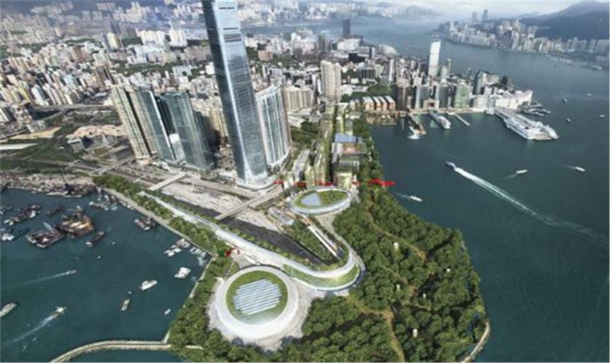 西九龍位于維多利亞港灣最后一塊填海區(qū),與廣東道接壤,西南面依傍著美麗的港灣。西九龍文化區(qū)選址在西九龍最南端,它的形狀像一把長柄勺子,這片由人工填海所形成的40?公頃土地,東西兩端長約1.4公里,沿海長度有2.3?公里。從地理地置上看,如果說維港是香港的一條項鏈,那么西九龍就是項鏈上最后一顆未經(jīng)雕琢的珍珠。