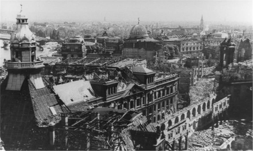 在第二次世界大戰(zhàn)中,遭到盟軍轟炸嚴重破壞的德累斯頓市中心。
