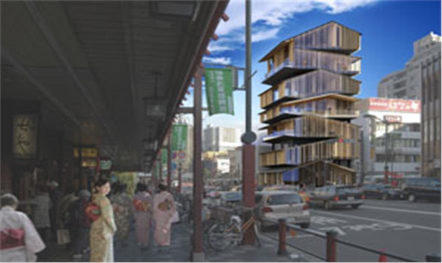 隈研吾為東京城區(qū)的“淺草旅游信息中心”設(shè)計的一個項目,類似一堆傳統(tǒng)風(fēng)格的斜屋頂住房。他說,他希望用這種建筑外觀展示日本的建筑。