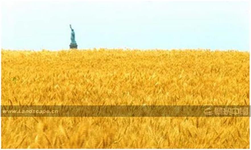 在麥田里遠(yuǎn)眺自由女神像和紐約港。