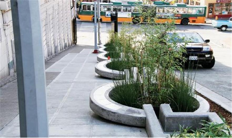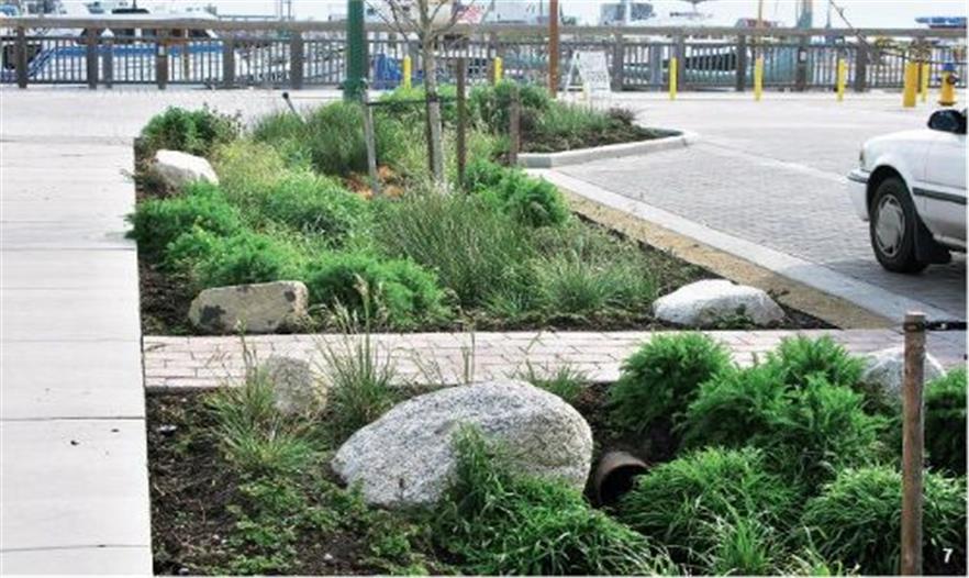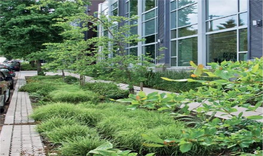屋頂和人行道上的徑流被漂亮的綠色植被所攔截,將流向街面的徑流量降到最低