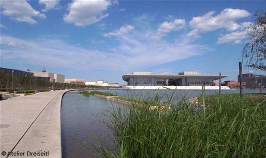 另外一個(gè)項(xiàng)目是中國天津文化中心。從“宜居城市”的角度來看,這個(gè)項(xiàng)目非常有趣。項(xiàng)目擁有一個(gè)中央湖泊,湖泊里的水來自整個(gè)場地鋪裝、建筑物屋頂?shù)挠晁占?。?xiàng)目運(yùn)用了很多“宜居城市”的理念,它的交通十分便利,場地僅供步行,行走于其間非常便捷、舒適。我們設(shè)計(jì)了大量綠色空間來創(chuàng)造更好的微氣候。除此之外,項(xiàng)目設(shè)計(jì)了一個(gè)為眾多場館類建筑物服務(wù)的基本能源系統(tǒng),大量可持續(xù)要素和宜居品質(zhì)被整合到項(xiàng)目中。它探討了如何從不同的層面和主題對“宜居城市”這一理念加以實(shí)施,景觀設(shè)計(jì)如何在未來扮演一個(gè)非常獨(dú)特的角色。項(xiàng)目不僅是規(guī)劃一個(gè)廣場、設(shè)計(jì)一個(gè)湖泊,而是創(chuàng)造了一個(gè)自然系統(tǒng),在高密度城市中呈現(xiàn)了鮮明姿態(tài),在其建成后擁有眾多的使用者。這是一個(gè)可供借鑒的關(guān)于如何在未來實(shí)現(xiàn)“宜居城市”的良好范例。