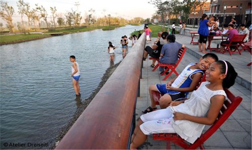 迪特爾•格勞:我在中國已從事多年項(xiàng)目工作,我們曾在天津建造了一個(gè)非常不同的項(xiàng)目,一個(gè)毗鄰河道的居住項(xiàng)目——天津張家窩社會山小區(qū),其主題是在居住區(qū)域?qū)崿F(xiàn)水敏感城市設(shè)計(jì),使水慢下來并把水引入開放空間,加強(qiáng)水的下滲以避免在這個(gè)地區(qū)發(fā)生任何類型的洪澇。最終,我們將受污染的河道轉(zhuǎn)變成為具備潔凈水體的河道空間,人們愿意重新來到這里并在水中玩樂。潔凈的水體景觀對人們具有重要價(jià)值,觀察人們?nèi)绾闻c水進(jìn)行直接互動(dòng),是項(xiàng)目中非常有趣的體驗(yàn)。水一旦變得干凈,年輕人和孩子們立刻就想到水中去,其他人則會停留在河邊并且享受它。為了讓人們體驗(yàn)清潔的水,特別是在城市中非常缺乏清潔水環(huán)境的中國,我們設(shè)計(jì)并配合完成了大量項(xiàng)目,這就是其中之一。