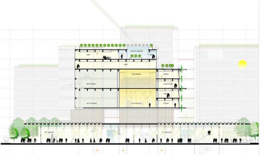 江南布衣總部位于杭州市西湖區(qū)天目山路,地處西湖與西溪之間,是集商業(yè)、秀場、藝術(shù)中心、美術(shù)館、買手店、辦公樓等多種功能于一體的新概念藝術(shù)園區(qū),將于2018年竣工。該項目由GOA攜手RPBW(Renzo Piano Building Workshop)倫佐•皮亞諾建筑工作室合作設(shè)計。設(shè)計師的基本想法是將建筑沿整個基地圍合出一個125m×95m的綠色廣場,稱之為“城市客廳”。建筑的底層通過內(nèi)退和通透的玻璃以實現(xiàn)懸浮的效果,并在頂層靠近廣場的一側(cè)減去兩層作退臺處理,為陽光開啟綠色通道。環(huán)繞廣場的建筑立面被設(shè)計成特殊的生態(tài)綠化幕墻,露臺和屋頂作為第五立面將種植杭州的標(biāo)志性樹種——茶樹,沿著廣場一圈的建筑立面被設(shè)計成特殊的生態(tài)綠化幕墻。廣場被斜線切割與打散,形成多樣的城市連接和滲透空間,并限定出不同的植被、鏡面水池及下沉廣場等豐富的景觀元素。其中經(jīng)過仔細推敲而創(chuàng)作的景觀節(jié)點,將成為項目中最有趣的元素之一。