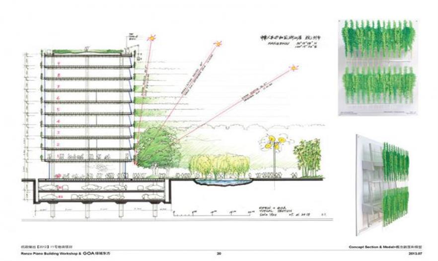 在項目初期的場地勘察完成之后,倫佐就畫了一個蘋果給我,他認(rèn)為建筑就像蘋果的表皮,打開蘋果表皮之后,內(nèi)部也應(yīng)該很豐富,有豐富的味道和豐富的內(nèi)涵。倫佐舉例他在巴黎的家,家的周圍有很多小廣場,廣場里有各種咖啡館和鍛煉、曬太陽等等各種各樣人的活動。他希望這樣的城市生活也能引入到這里。另外,他認(rèn)為杭州是一個自然環(huán)境非常優(yōu)美的地方,在這里可以體會到建筑與自然的和諧互動。他希望江南布衣總部的內(nèi)部是綠色的,于是把垂直的綠化作為這個場所最主要的表現(xiàn)力。在屋頂種植茶樹,這也是受杭州的生活體驗啟發(fā),屋頂上的茶樹不僅可以遮陰、被飲用,同時可以體現(xiàn)這種建筑與自然的互動的感覺。