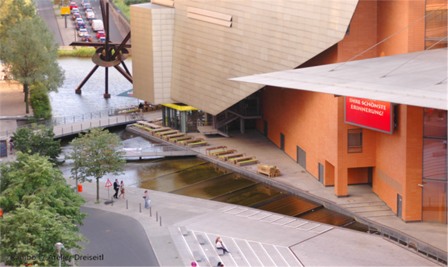 布呂克曼: 波茨坦廣場的難點有兩方面。第一方面是之前德國剛剛實施頒布了一部分法令,它規(guī)定在城市區(qū)域新開發(fā)的地方,產(chǎn)生的暴雨徑流需要進行源頭管理,通過進化儲存慢慢地釋放到周邊的河道中去。第二個是和我們合作的建筑師Renzo Piano,他在規(guī)劃的體系當中,把城市水體看成了一個非常重要的空間元素,這就對水質(zhì)提出了非常高的要求。但最后我們把設(shè)計的要求和水系統(tǒng)功能的要求結(jié)合了起來,成功地完成了項目。