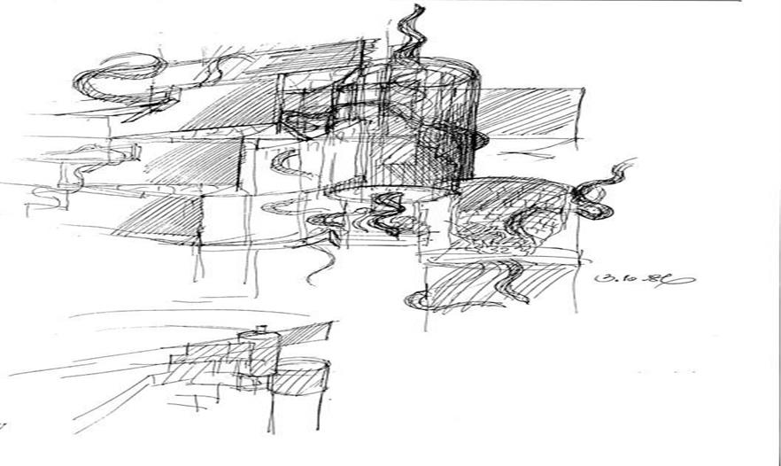 澤維·霍克(Zvi Hecker): 從個人的角度而言,我盡可能地遵循自己的常識、并最終完善設(shè)計中的思索。但我并非試圖得到一種僅屬于自己的獨特表達(dá)。這樣的嘗試必然是徒勞的。我相信當(dāng)你在自家花園耕作時,一定會得到與自己播撒的種子所相應(yīng)的果實。作為一名年輕的建筑師,我有意地避免以勒·柯布西耶為范例,盡管這很誘人。我的一些同齡人便掉入這樣的陷阱。我欣賞賴特的建筑和他自大的姿態(tài)。布魯斯·葛夫(Bruce Goff)曾經(jīng)告訴我,賴特是這樣評價他最新的設(shè)計的:"布魯斯,你在試著嚇唬誰呢?"然后他又補充道:"但是我們的確有時會嚇到他們。"(笑)