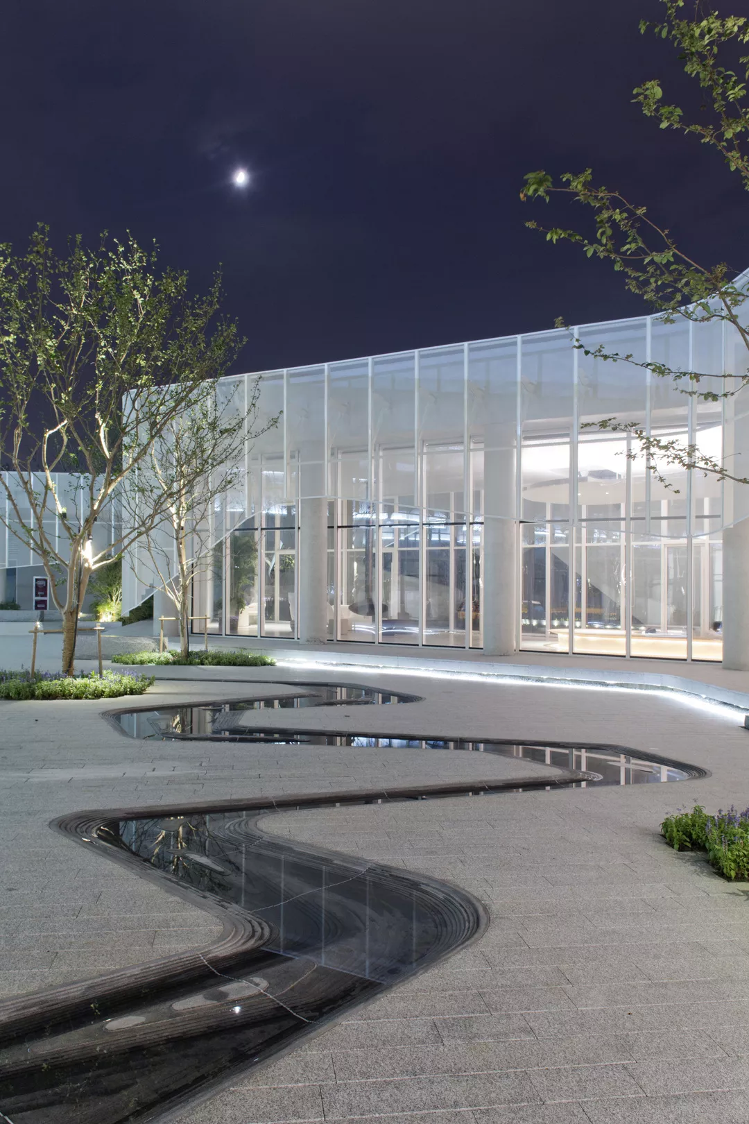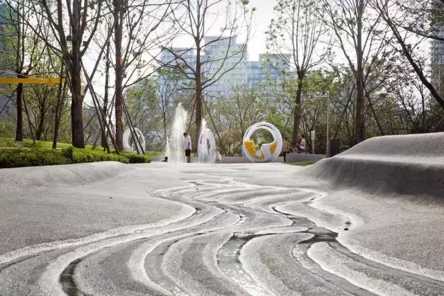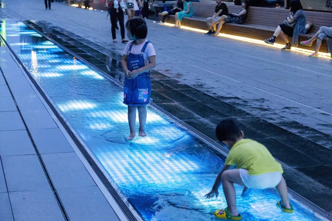 北京萬科時(shí)代中心——光之廣場。由于建筑北側(cè)的廣場是消防通道,除了鋪裝外不能進(jìn)行綠化,也不能建造任何凸起或下凹結(jié)構(gòu),但是,巨大的鋪裝廣場需要被激活。通過現(xiàn)場觀察,設(shè)計(jì)師發(fā)現(xiàn)這里總是存在建筑投射的陰影,“光”成為場地面臨的最大問題。團(tuán)隊(duì)采用玻璃材料結(jié)合LED互動(dòng)燈光的水景設(shè)計(jì),將“光”引入城市,并借助光線變化記錄時(shí)間季節(jié)變化,使這里成為了一個(gè)頗具吸引力的城市場所。 ? 張?zhí)凭坝^ / 攝影:張海