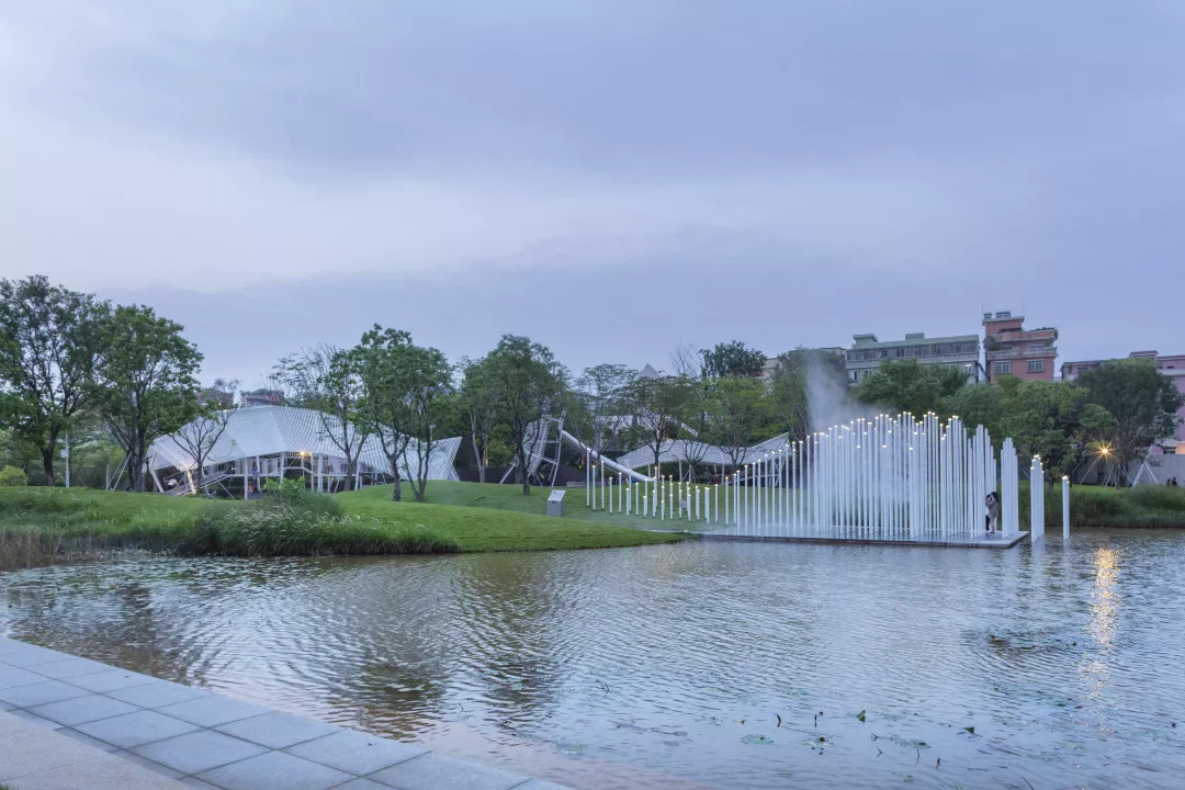 廣州大魚公園。嘗試在滿足周邊人群日常使用需求的前提下,為場地設(shè)計(jì)一套自維持的水文循環(huán)系統(tǒng),通過收集場地的降雨,并借由沉水植物濕地系統(tǒng)凈化水體,形成公園中重要的湖區(qū)景觀。 ? 張?zhí)凭坝^