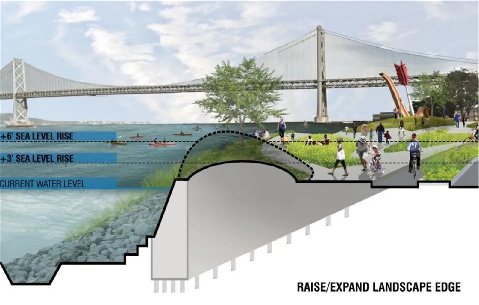 過去四年,我負責(zé)了舊金山港口濱水空間的韌性規(guī)劃和城市設(shè)計(Port of San Francisco Waterfront Resilience Program)項目。我們與舊金山港口管理局(Port of San Francisco)、嘉科工程(Jacobs Engineering)和SITELAB城市設(shè)計事務(wù)所(SITELAB Urban Design Studio)合作,共同探討如何以適應(yīng)性設(shè)計去減小海平面上升和地震這兩種風(fēng)險對12公里舊金山海岸線帶來的威脅。這樣的挑戰(zhàn)讓我們有機會去重新構(gòu)想更安全且對人類友好的濱水區(qū)——改善濱水區(qū)的可達性、娛樂性,提供干凈的空氣、舒適的環(huán)境,以及支持生物多樣性并實現(xiàn)固碳的動植物棲息地。所有這些好的事物都是來自于改變的需要,也更是機遇。