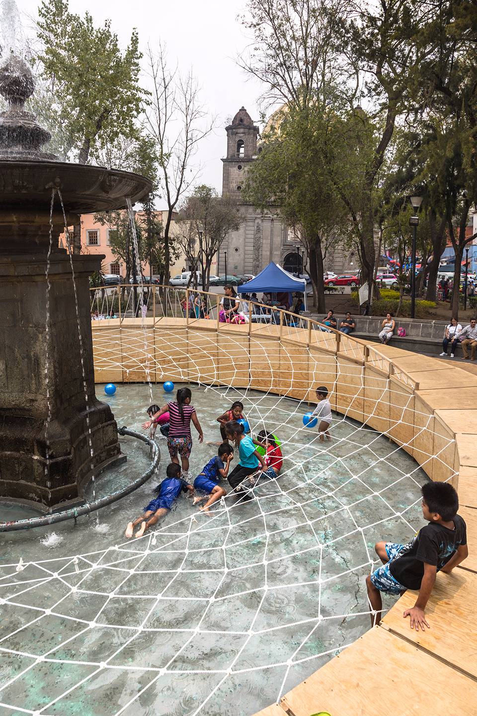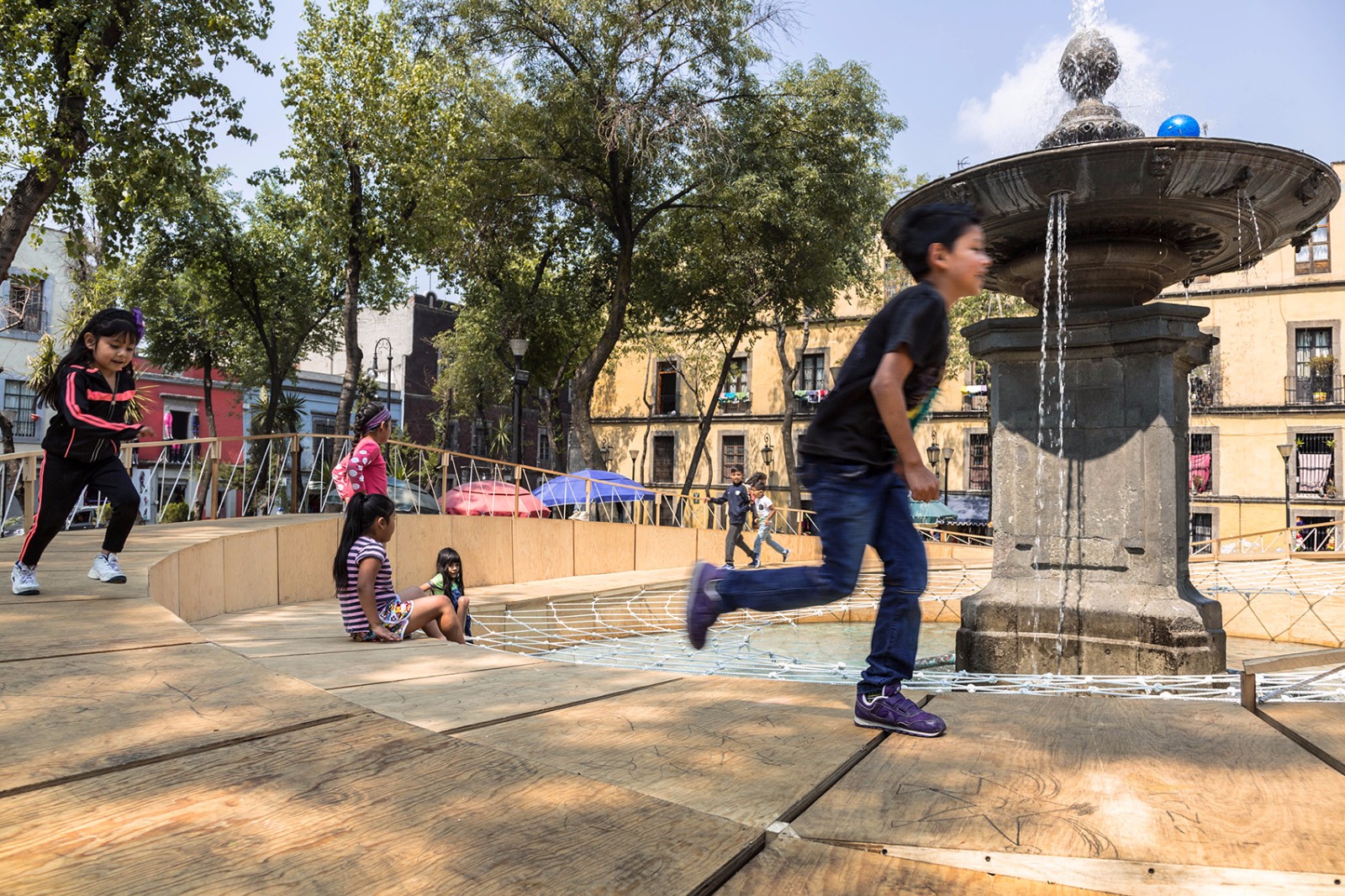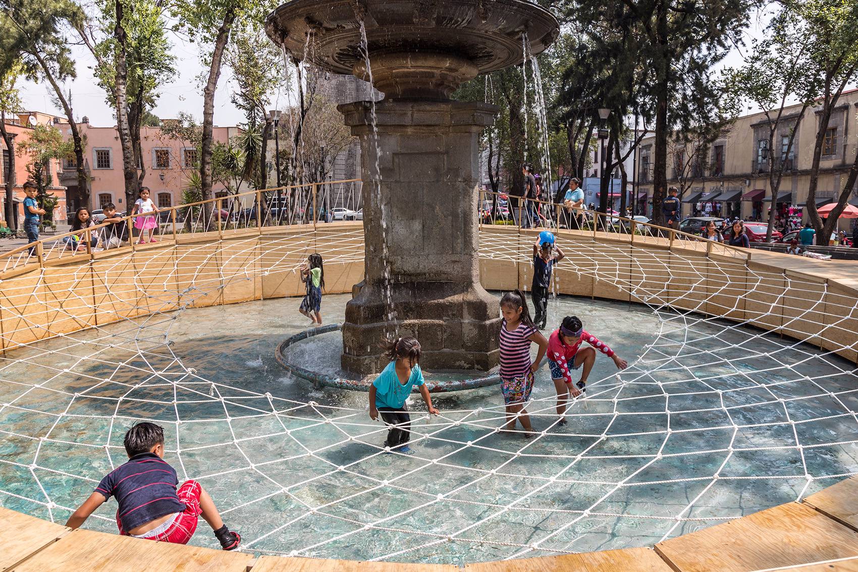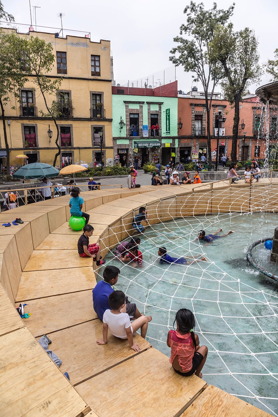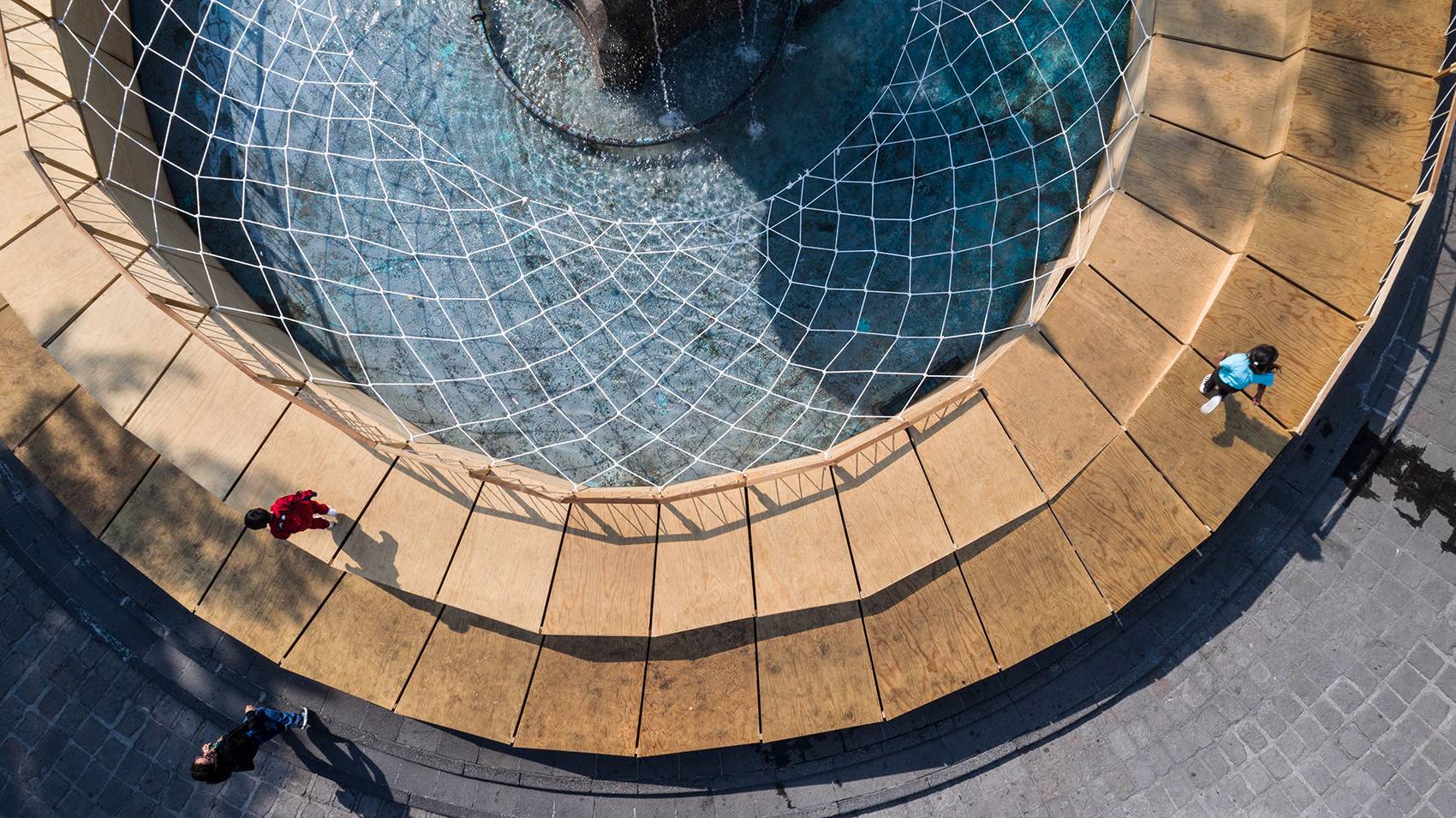 設(shè)計師將游戲場地設(shè)置在標(biāo)志性的廣場噴泉周圍,以避免對廣場上的交通和日?;顒有纬勺璧K。設(shè)計師利用廣場上既有的長椅等元素創(chuàng)造了一個安全而獨特的環(huán)境,孩子們可以在這里自由地嬉戲和探索。設(shè)計圍繞不同的游戲類型構(gòu)建出了一個適合兒童玩耍的物理空間。兩個圓環(huán)狀的坡地以同心圓的形式放置,帶來有趣的水平變化。水池上的織網(wǎng)在鼓勵互動游戲的同時還起到了保障安全的作用。