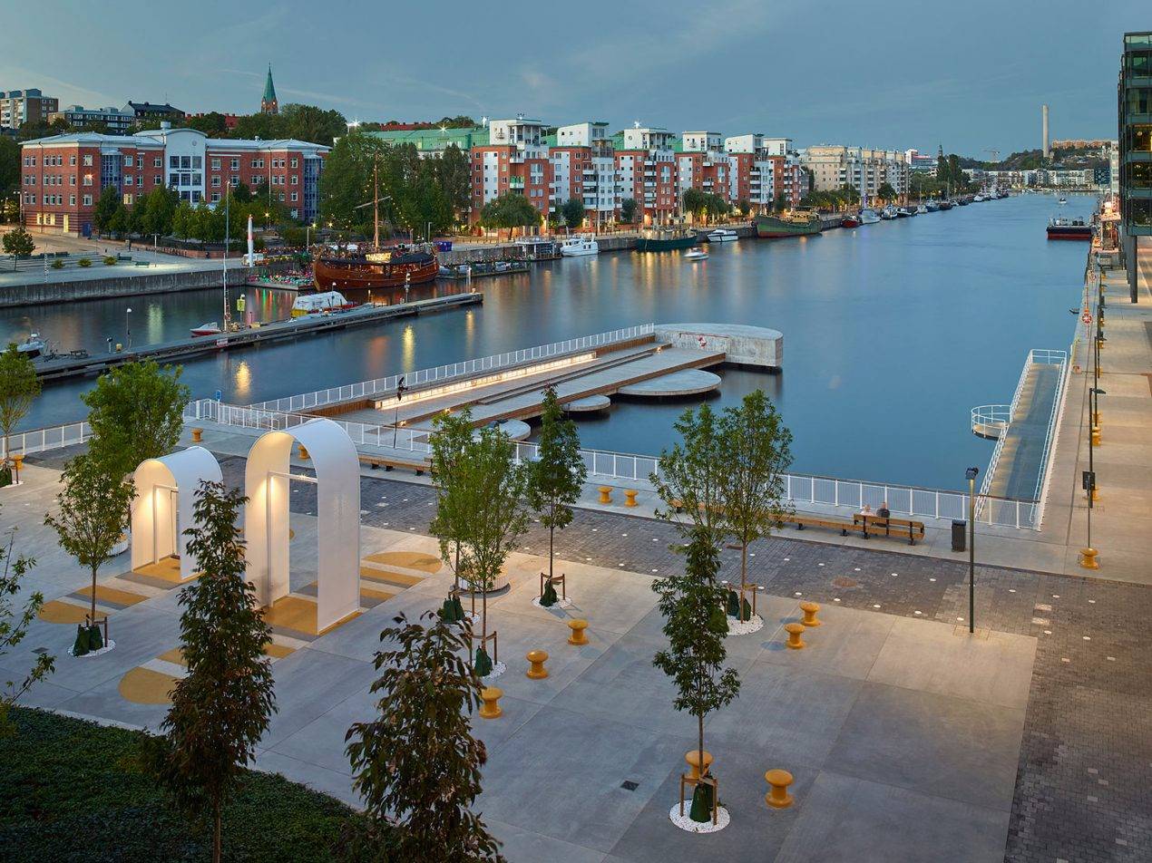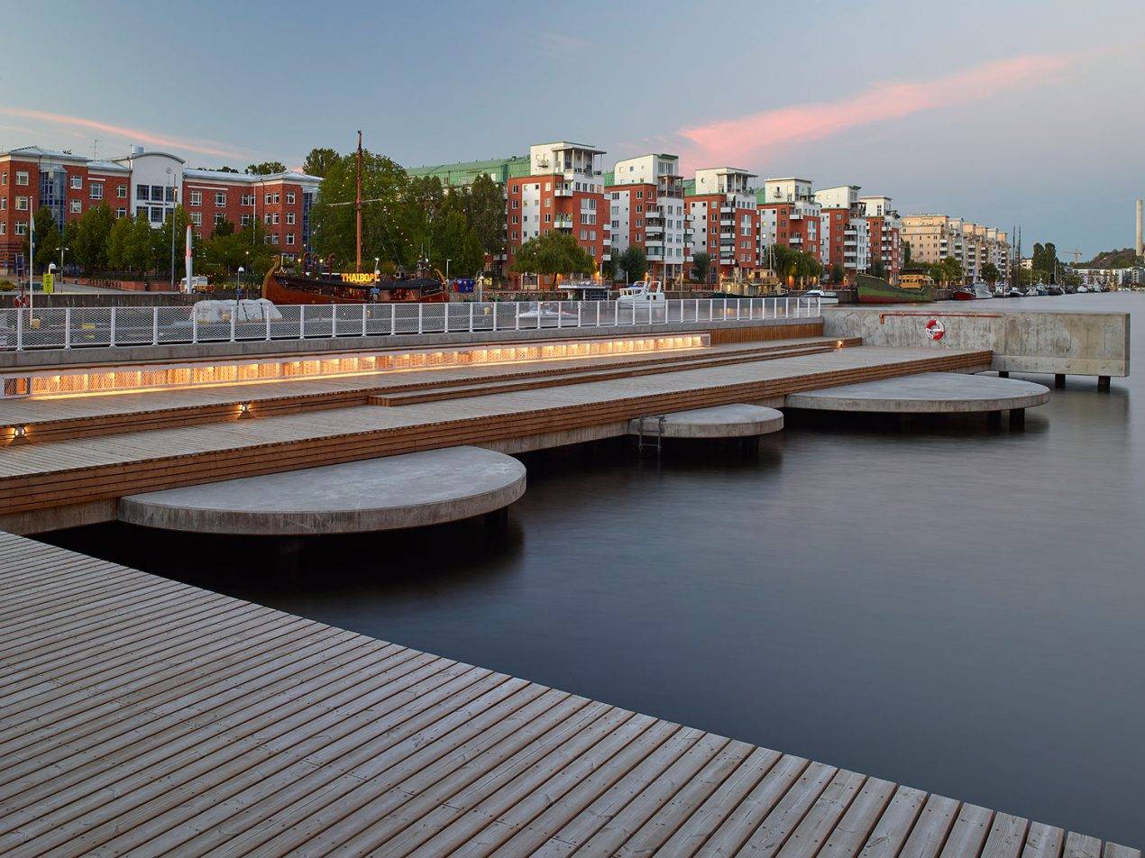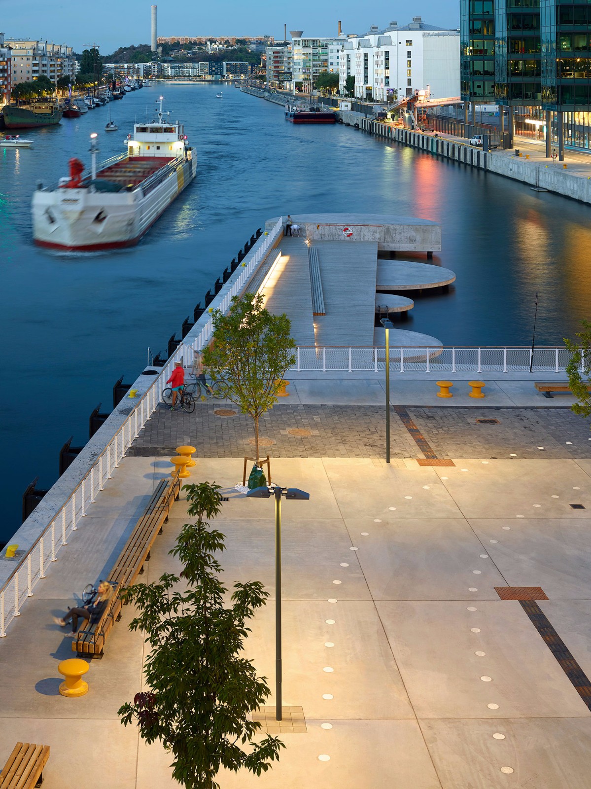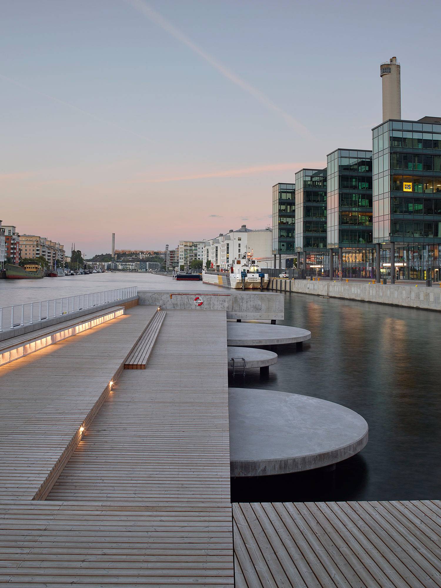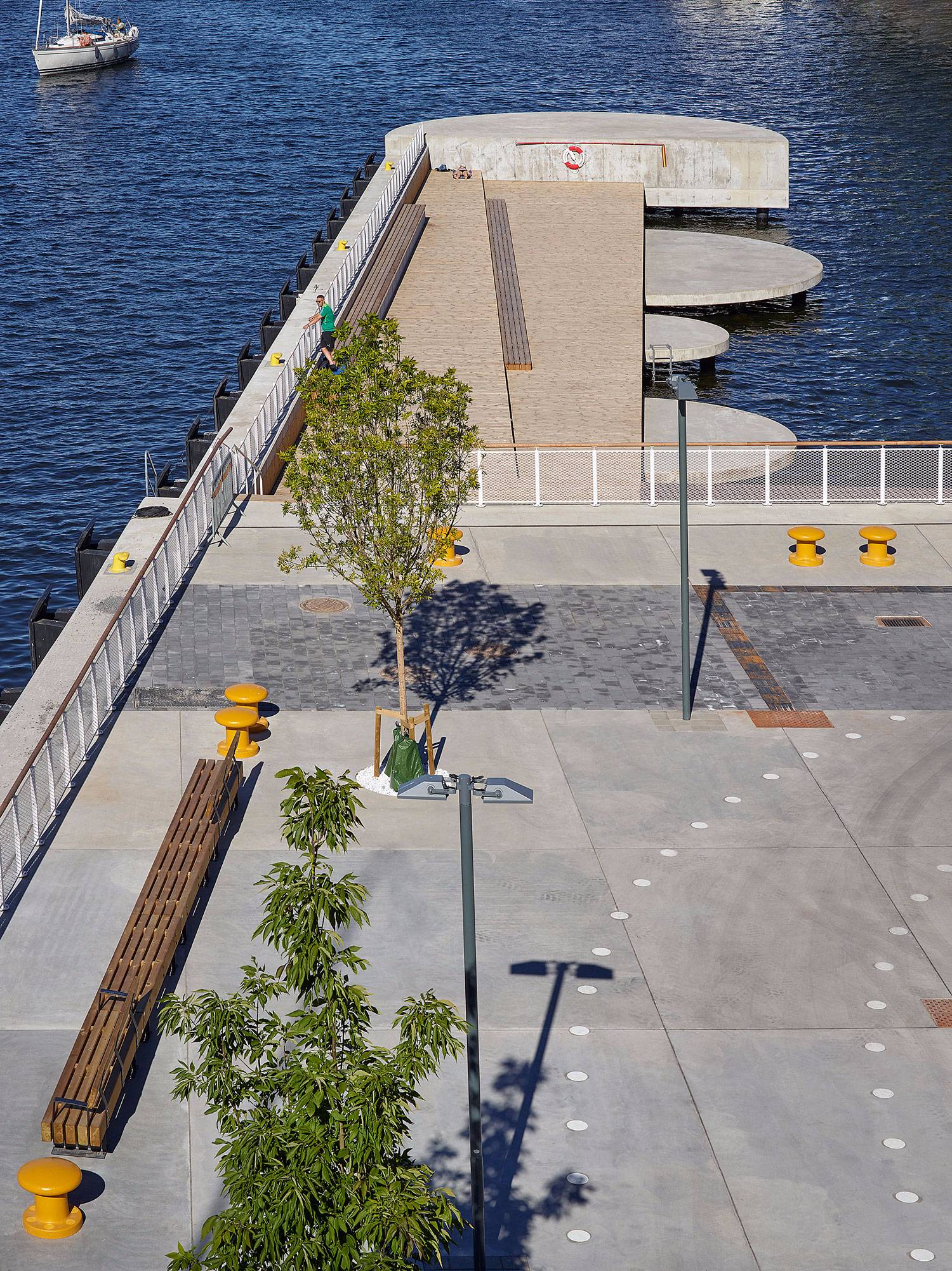 碼頭的特點(diǎn)是大型混凝土板,明亮的黃色座位,靈感來自傳統(tǒng)的系泊護(hù)柱和白色圍欄?;⌒巫鳛橐环N反復(fù)出現(xiàn)的形式來自相鄰的Skans Bridge的兩個(gè)20世紀(jì)20年代的舊混凝土拱門。