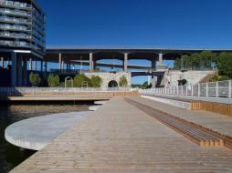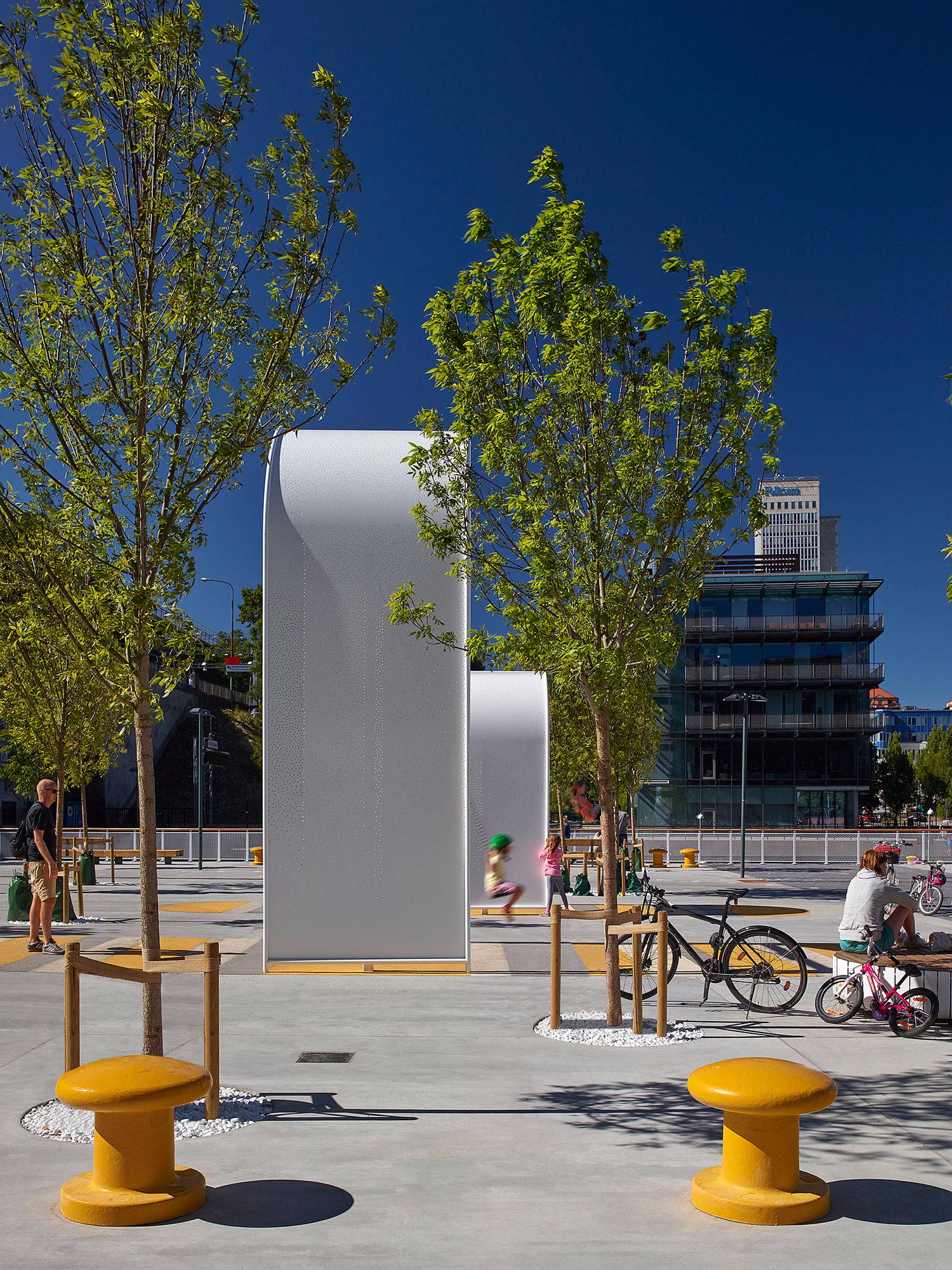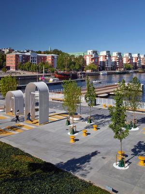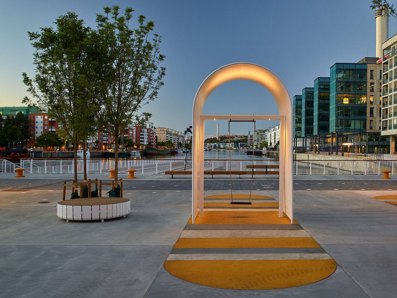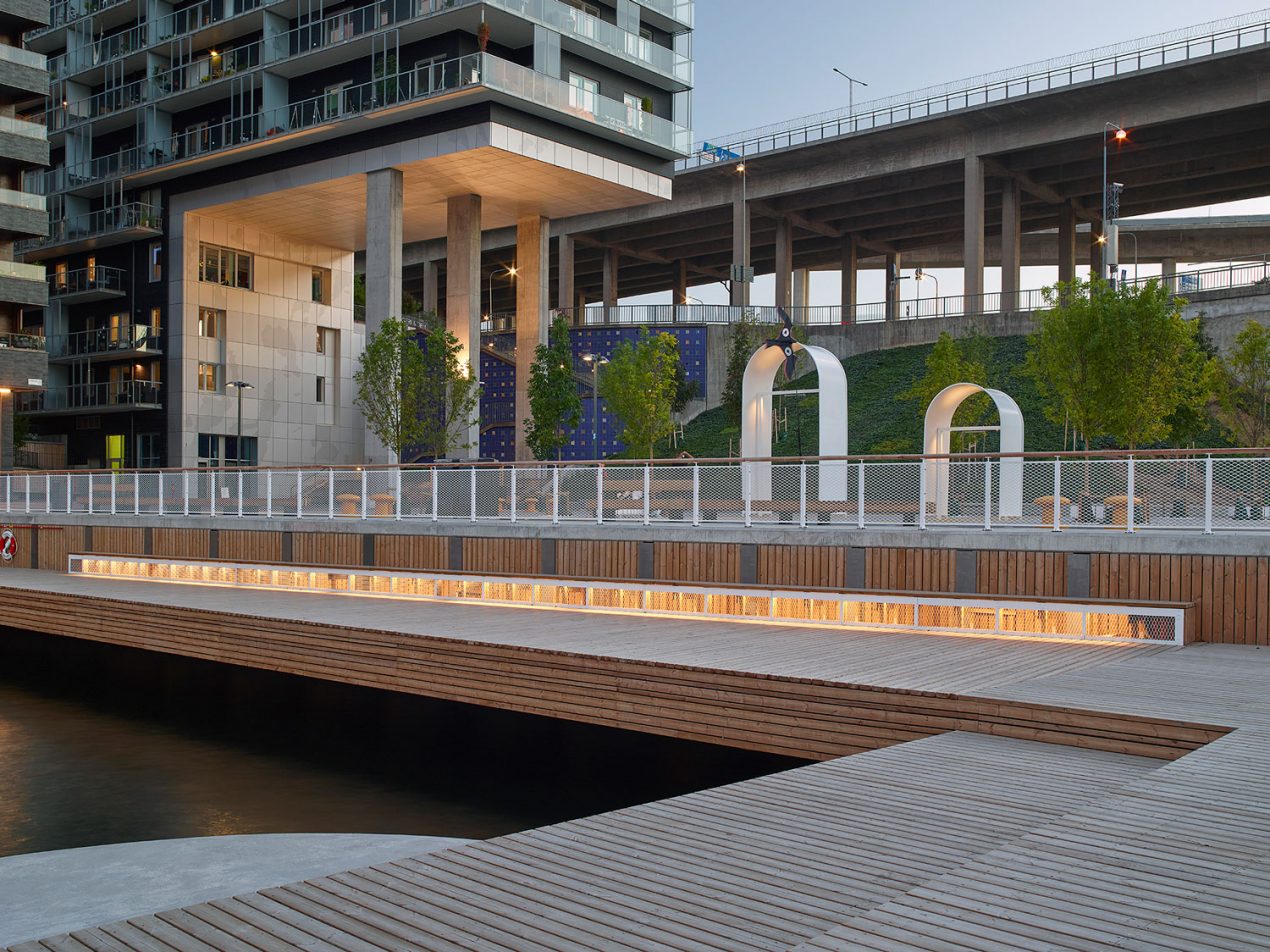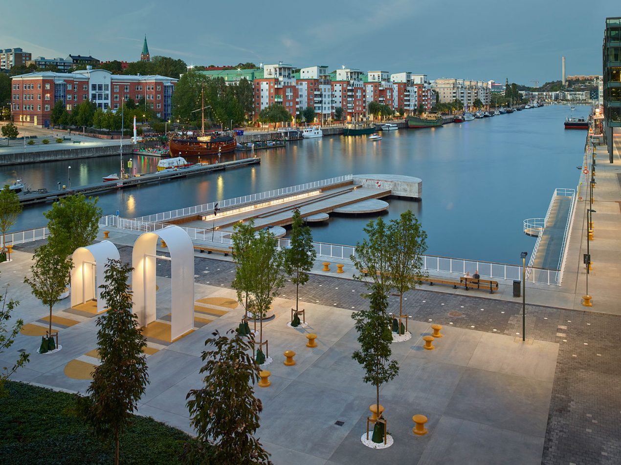 碼頭的特點(diǎn)是大型混凝土板,明亮的黃色座位,靈感來自傳統(tǒng)的系泊護(hù)柱和白色圍欄?;⌒巫鳛橐环N反復(fù)出現(xiàn)的形式來自相鄰的Skans Bridge的兩個(gè)20世紀(jì)20年代的舊混凝土拱門。