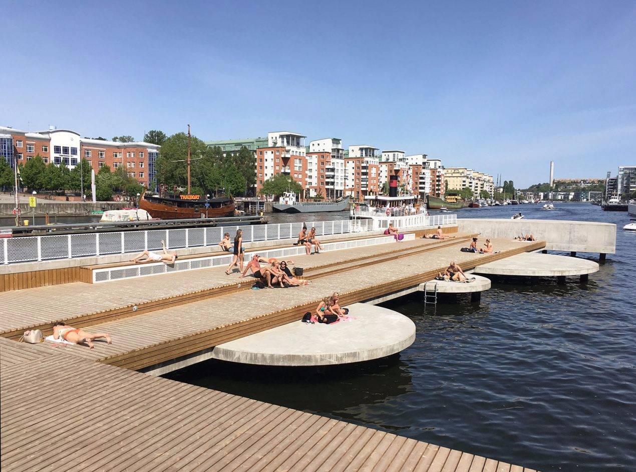Fredriksdalskajen朝北,但由于東北部的長(zhǎng)木碼頭,該地區(qū)最陽光明媚的位置可用于日光浴和野餐。