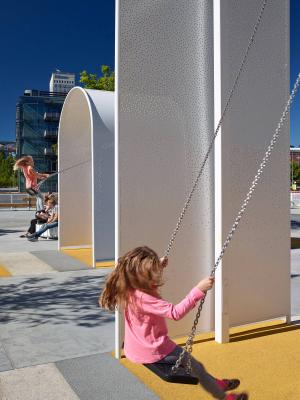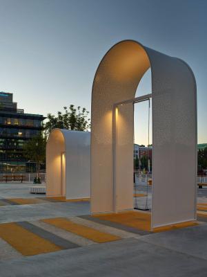 在西方看來,它們與秋千的白色金屬拱門,木質(zhì)碼頭上的半圓形光滑混凝土板和坡道的拱形平臺(tái)相互作用。