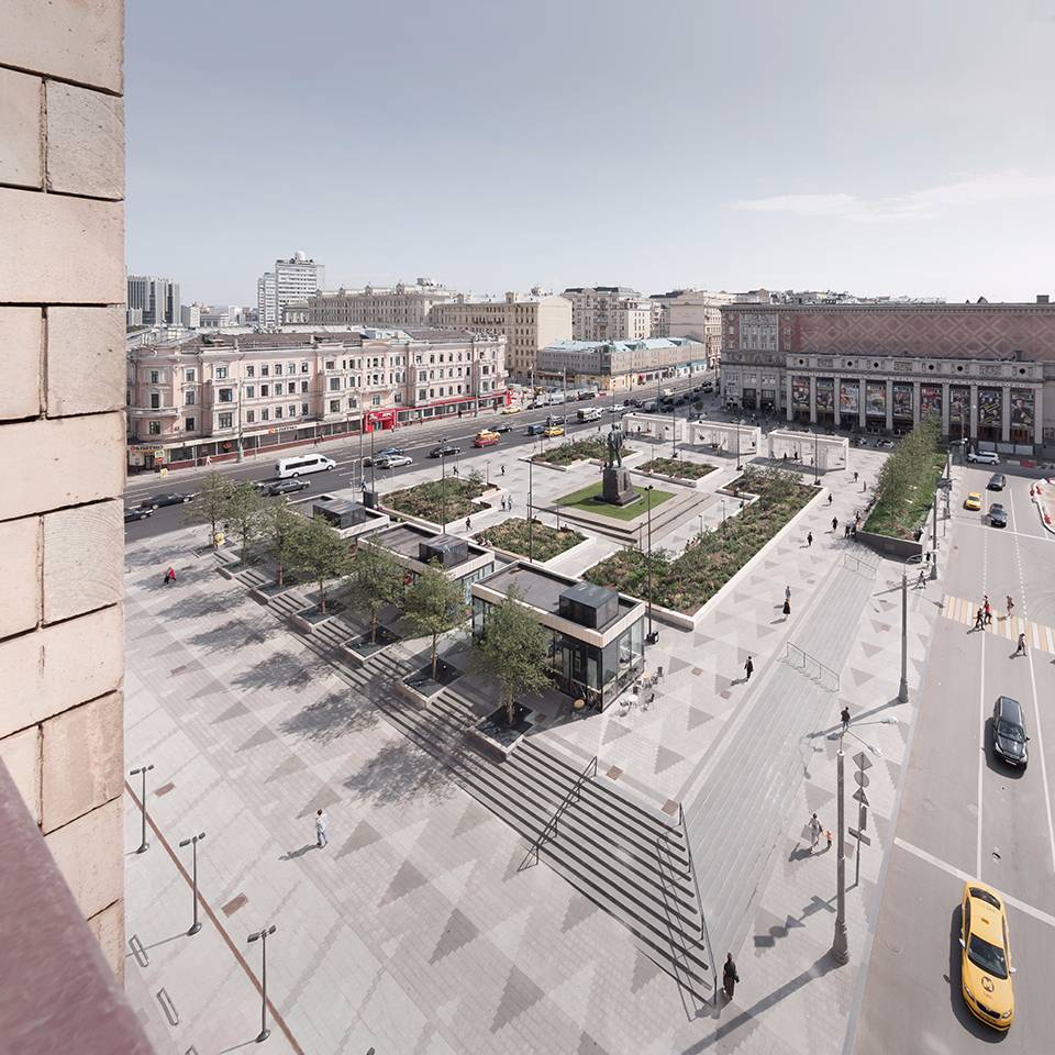 Triumfalnaya廣場位于莫斯科的主要街道Tverskaya旁邊的交叉口處。 Buromoscow 在2013年莫斯科首次公開競標(biāo)公共廣場項目中勝出,負(fù)責(zé)此項目。這次競標(biāo)的目標(biāo)是為了復(fù)蘇這個由前蘇聯(lián)建筑師Chechulin在1958年建造的城市廣場,此前,這個廣場的一半面被停車場占用。 Buromoscow對該廣場的設(shè)計提出了5個步驟: