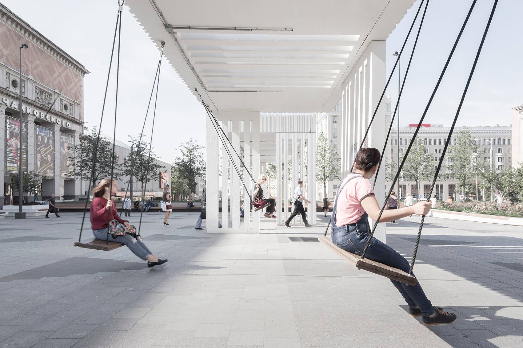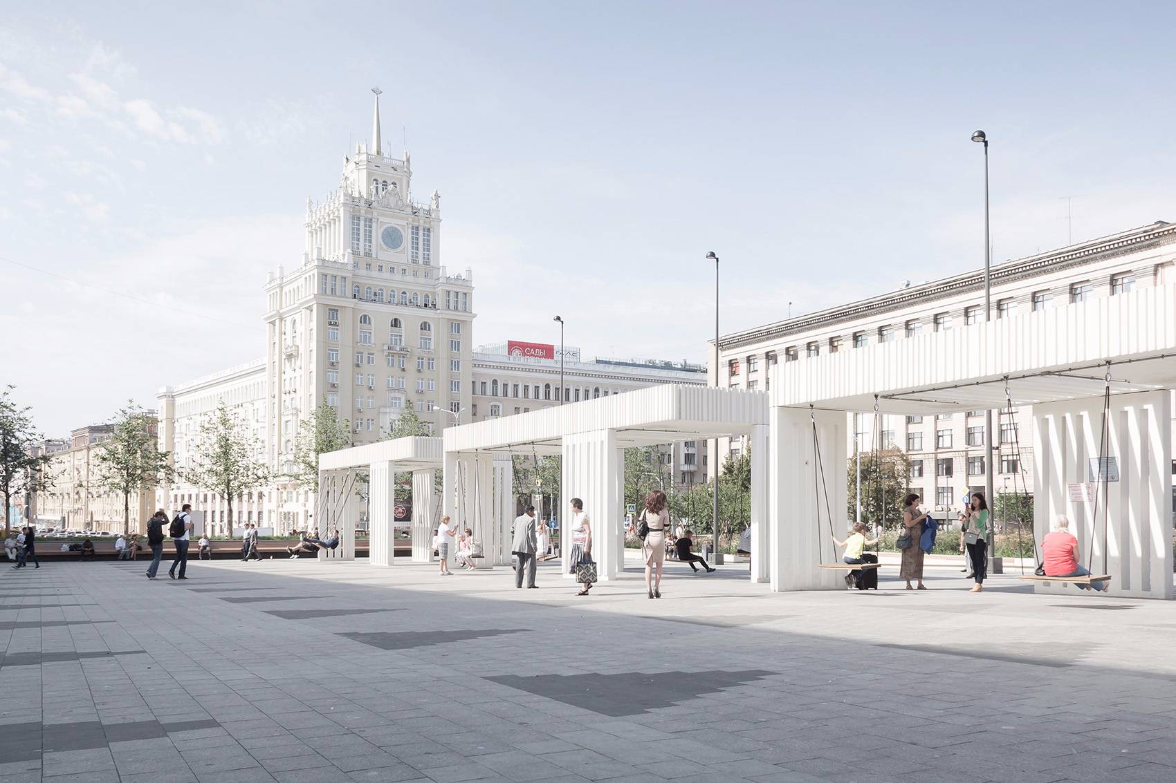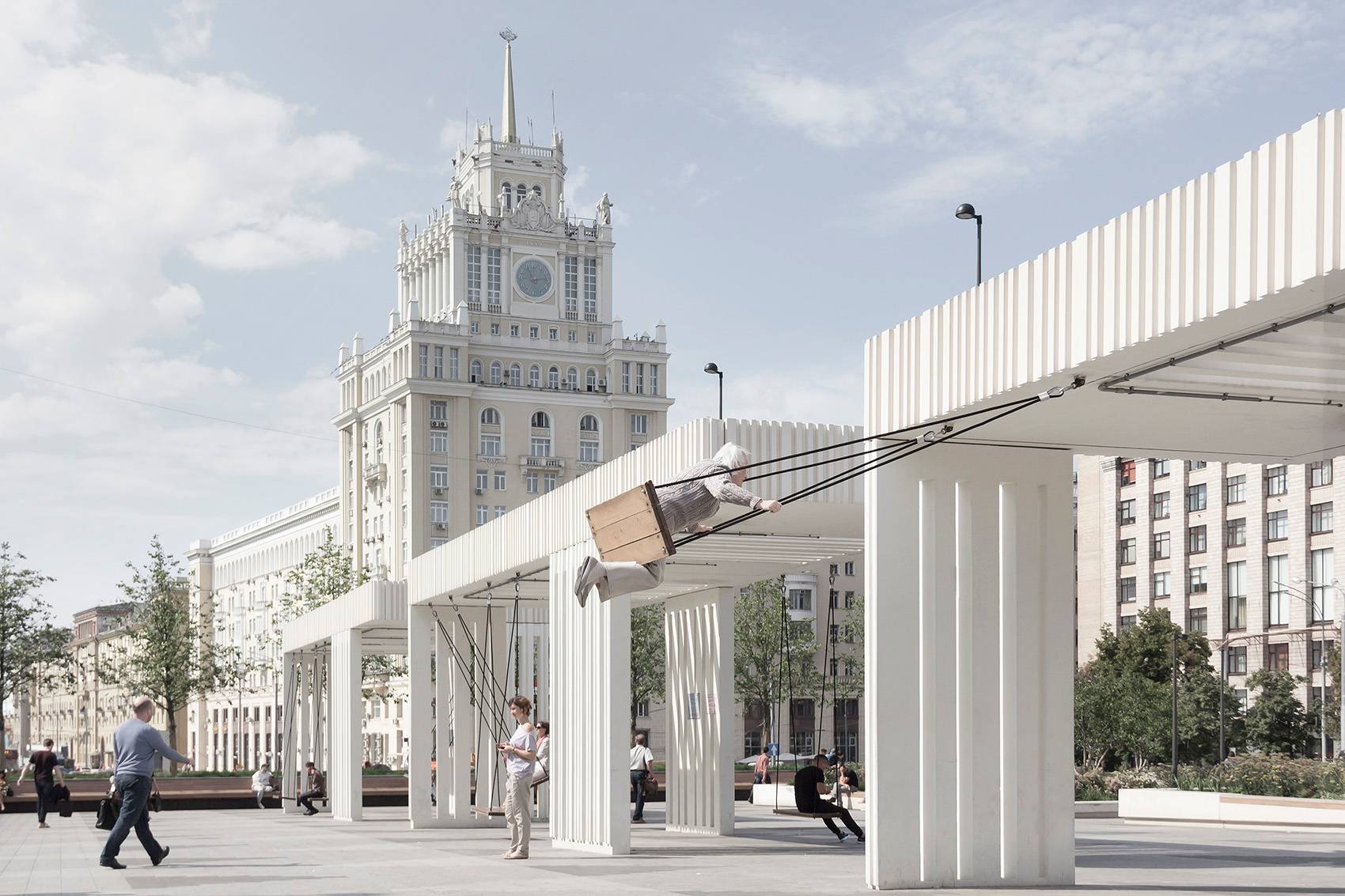 Triumfalnaya廣場已于2015年交付竣工。經(jīng)過改造,它從一個通行空間演變成了一個留停留空間,人們可以在此實現(xiàn)各種活動,比如聚會,喝咖啡,街邊演奏,滑滑板等。 豐富的活動和用途使這個改造后的廣場很快家喻戶曉。而其中別具一格的秋千設(shè)計,更是吸引著眾多莫斯科人前來享受其中的樂趣。