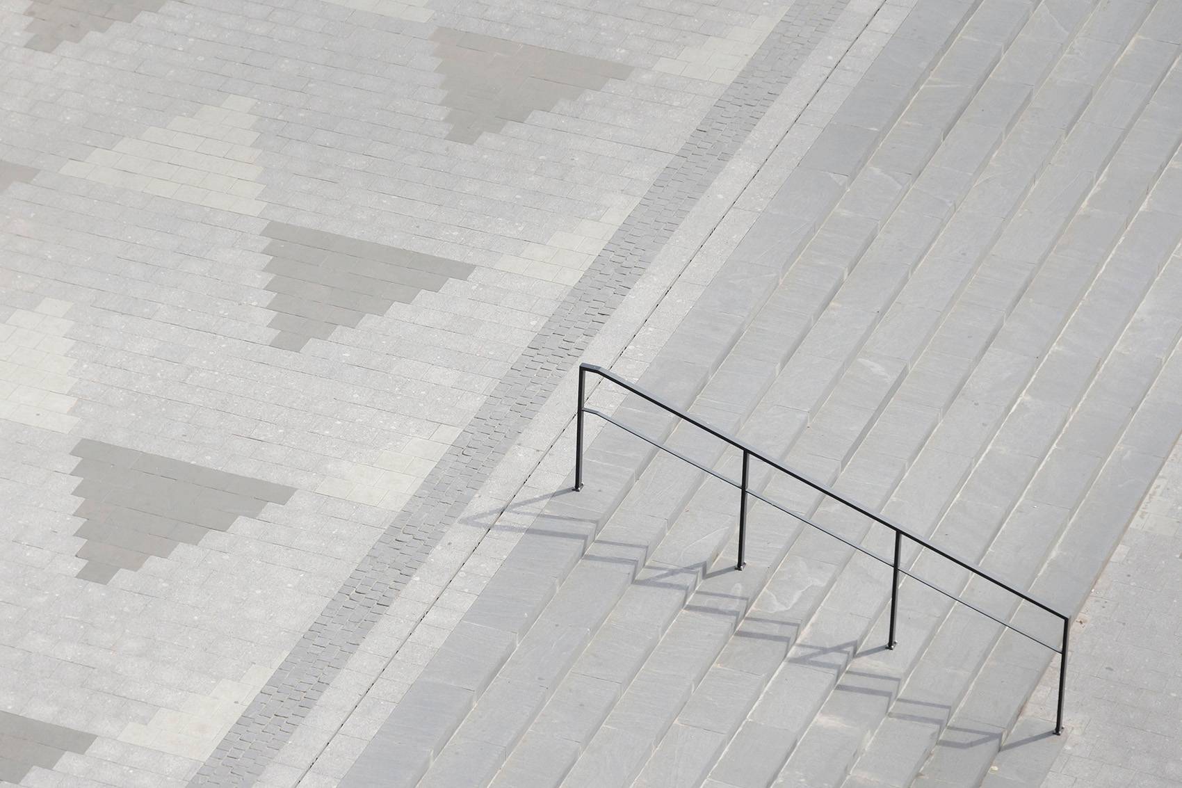 設(shè)計步驟 2:平整場地用地。廣場表面曾呈現(xiàn)明顯坡面,因此對其內(nèi)部活動造成了一定影響。 設(shè)計師通過平整土地,提升邊緣用地高度,將廣場從繁忙的街道上獨立了出來。