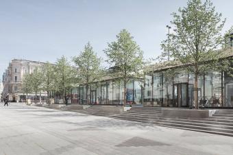 設(shè)計步驟 3:重塑古典風(fēng)格。設(shè)計師在廣場采用了古典的蘇聯(lián)式外墻, 并以軸線式設(shè)計和行道樹強化古典構(gòu)圖風(fēng)格。
