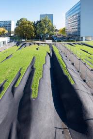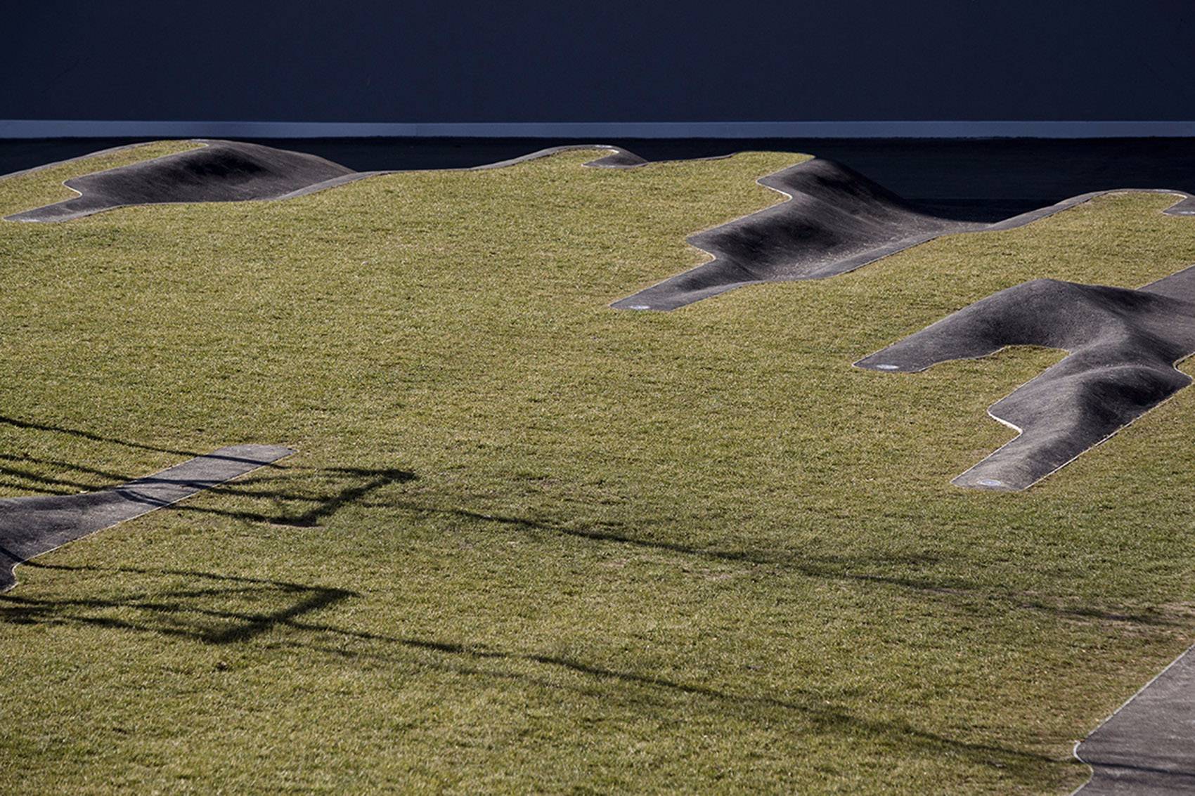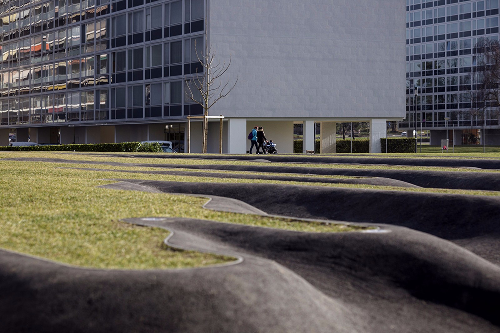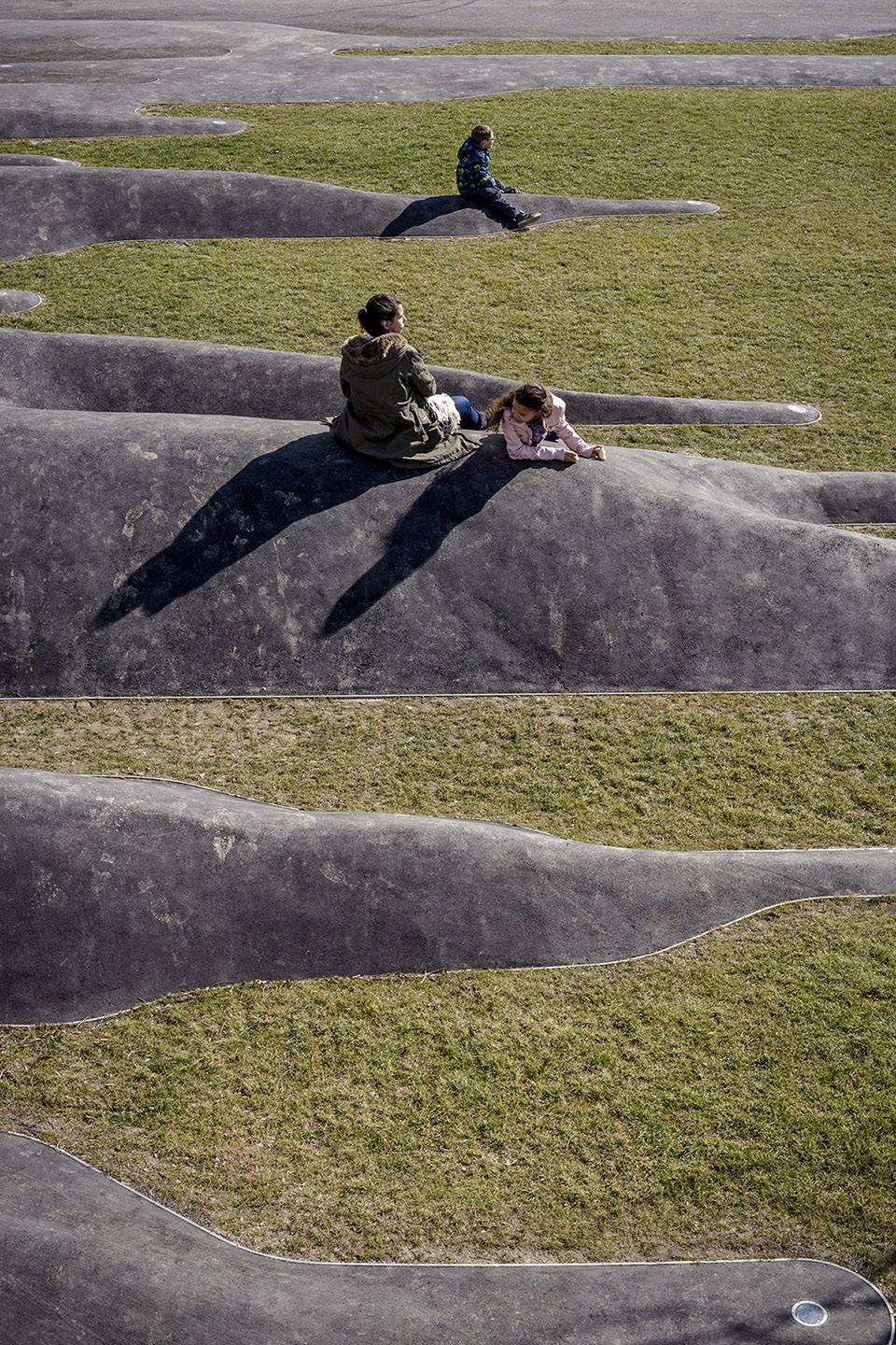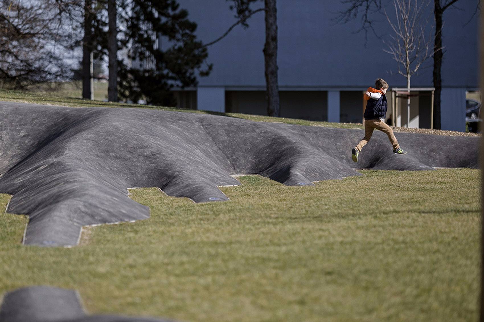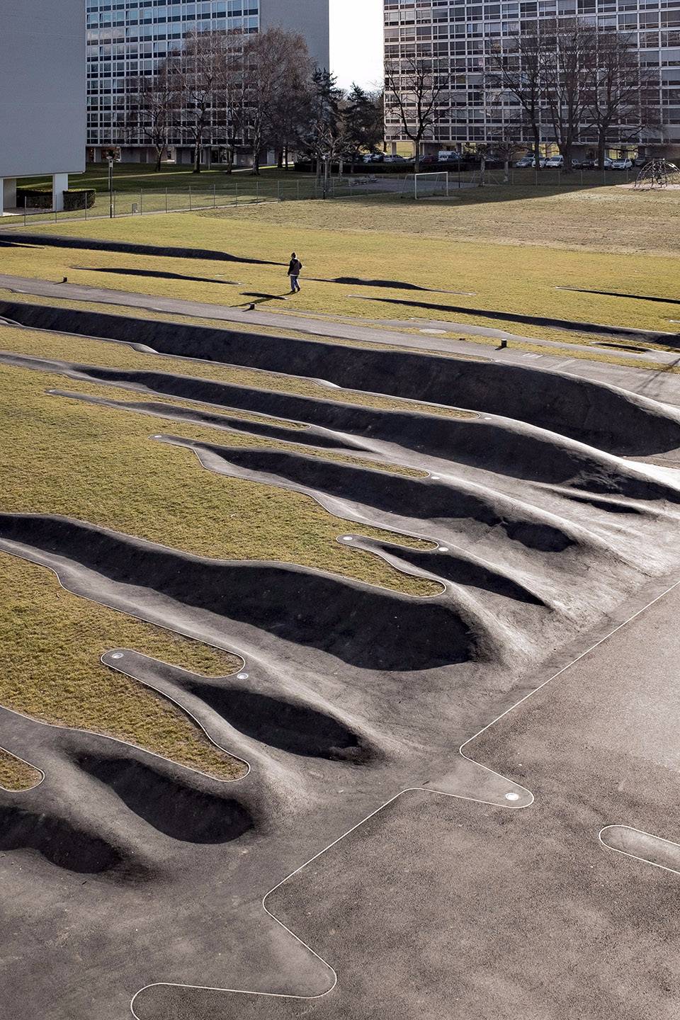 從高處看,“童年的印記”像是一張Jura山起伏地貌景觀的圖片鋪在地上,這個(gè)景觀其實(shí)是一個(gè)假山模型。其形態(tài)可以滿足人們?cè)谄渲行凶摺2煌谝话愕钠教沟孛?,這種折疊起伏的空間形式為孩子們提供了更多樣的玩耍體驗(yàn)。由近到遠(yuǎn),從起伏的曲線地面到建筑天際線,身處其中孩子們會(huì)隨著地形的變化觀察和體會(huì)到 MEYRIN-PARC的天空,valley of Geneva以及Jura的山地。
