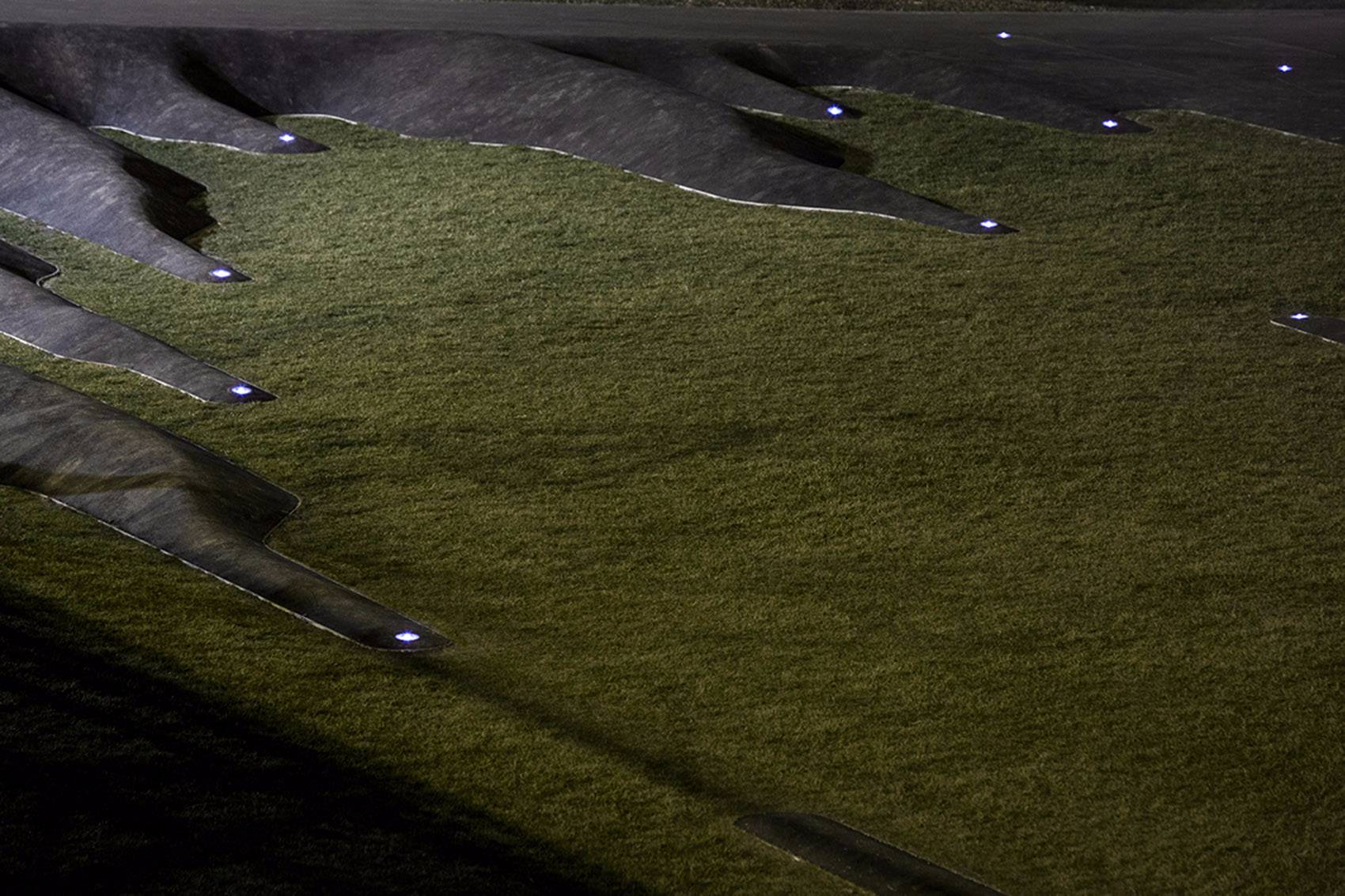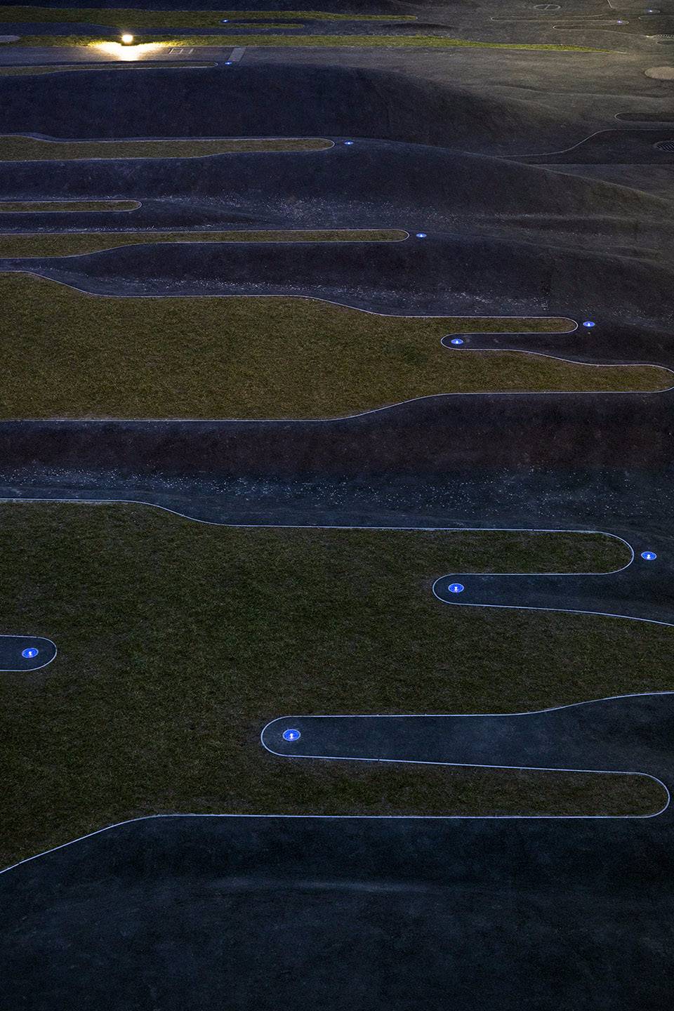 ▼雕塑夜景,其抽象的大地景觀形式體現(xiàn)著設(shè)計(jì)師將藝術(shù)創(chuàng)作融入到景觀當(dāng)中的設(shè)計(jì)思路