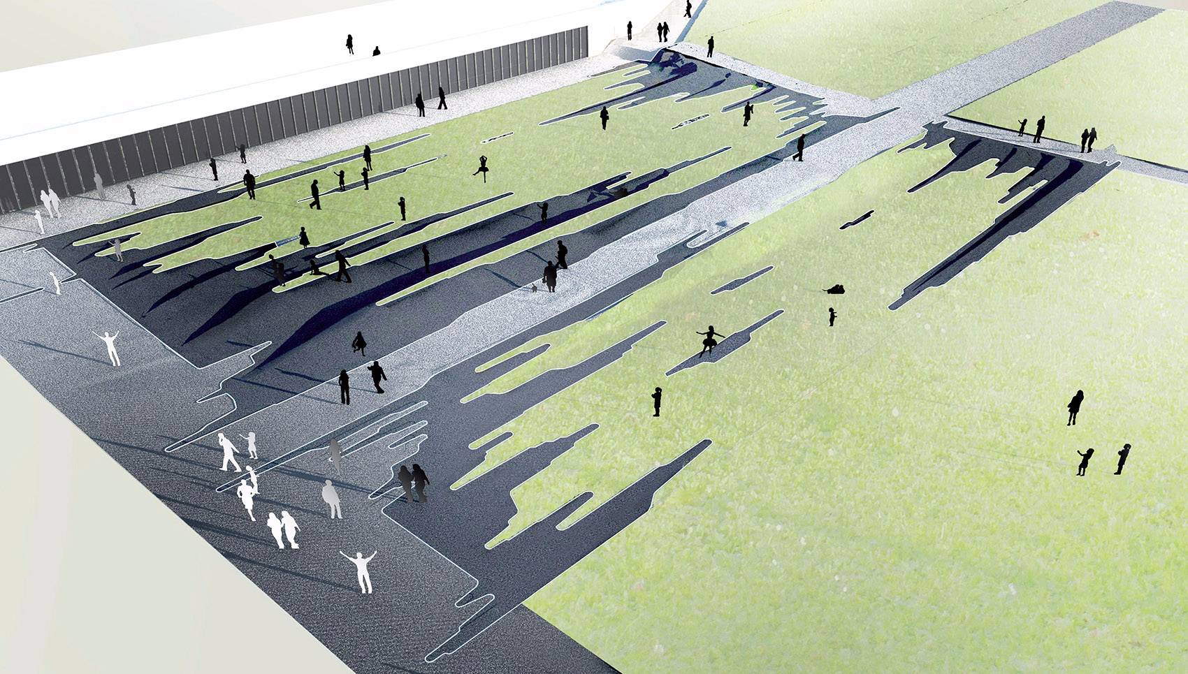 “童年的印記”這個(gè)雕塑景觀的設(shè)計(jì)思想是將一個(gè)景觀嵌入到另一個(gè)景觀中。該景觀在這個(gè)場(chǎng)地中既涉及到了物理層面,也涉及地域范圍上的地理層面。而這種將雕塑景觀(曲線形式)嵌入到現(xiàn)有場(chǎng)地(直線形式)中,以對(duì)比的形式強(qiáng)化了場(chǎng)地特征。