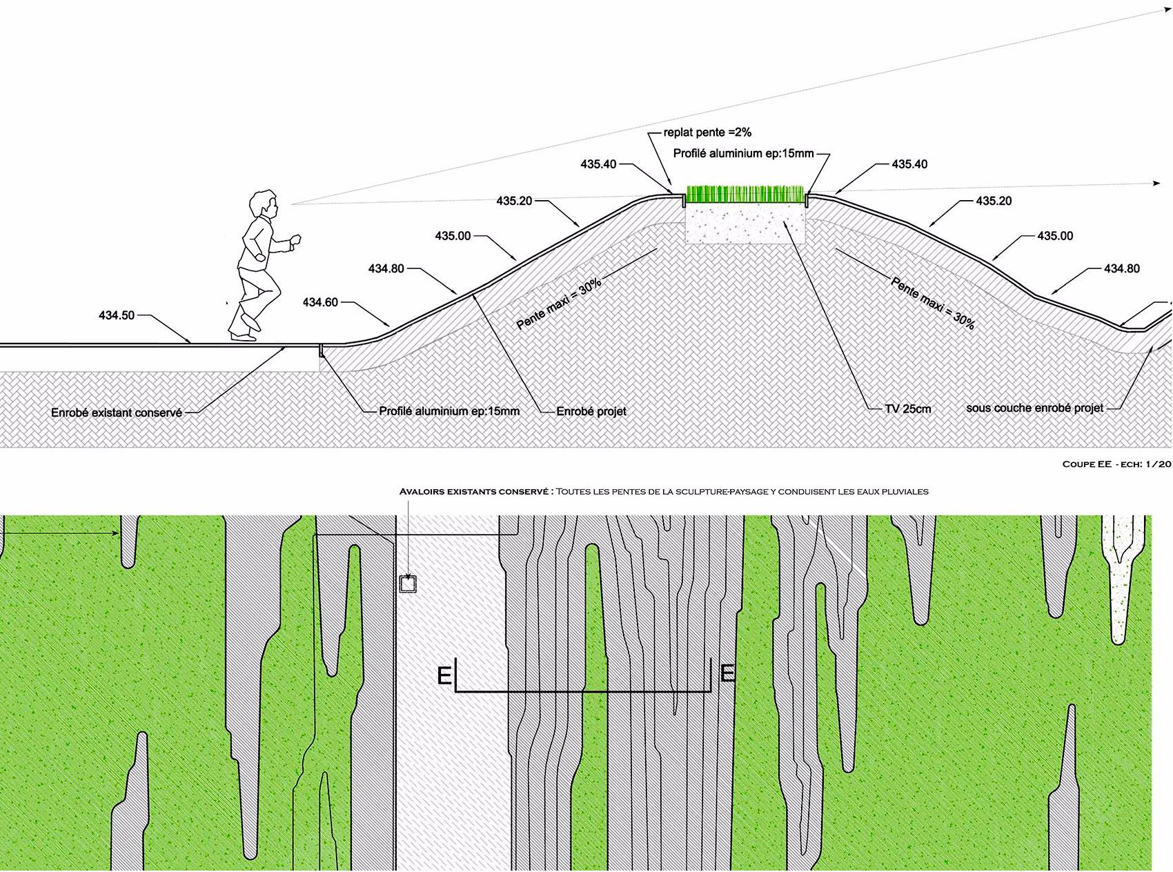 “童年的印記”是一個(gè)雕塑景觀,以碩大延展的形式展現(xiàn)在Boudines地區(qū)。它占地2600 m2,形態(tài)酷似Jura地區(qū)廣闊起伏的地貌景色。