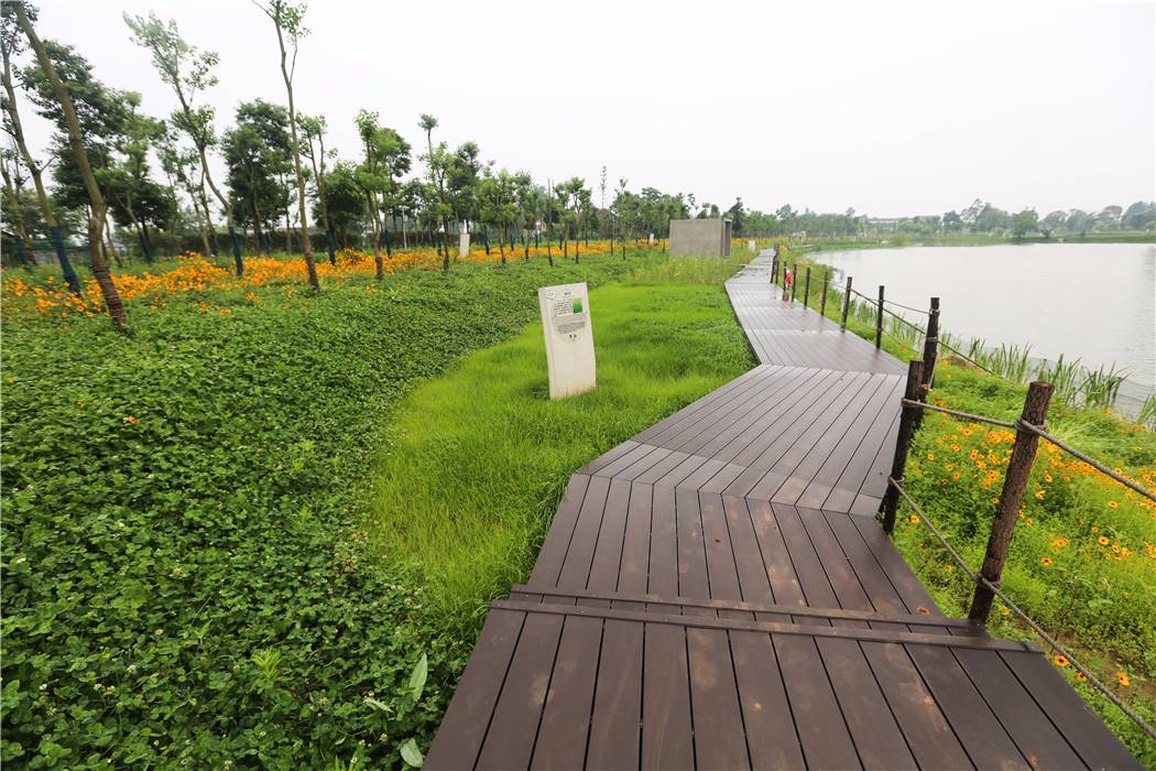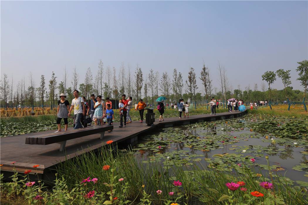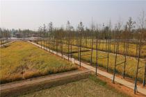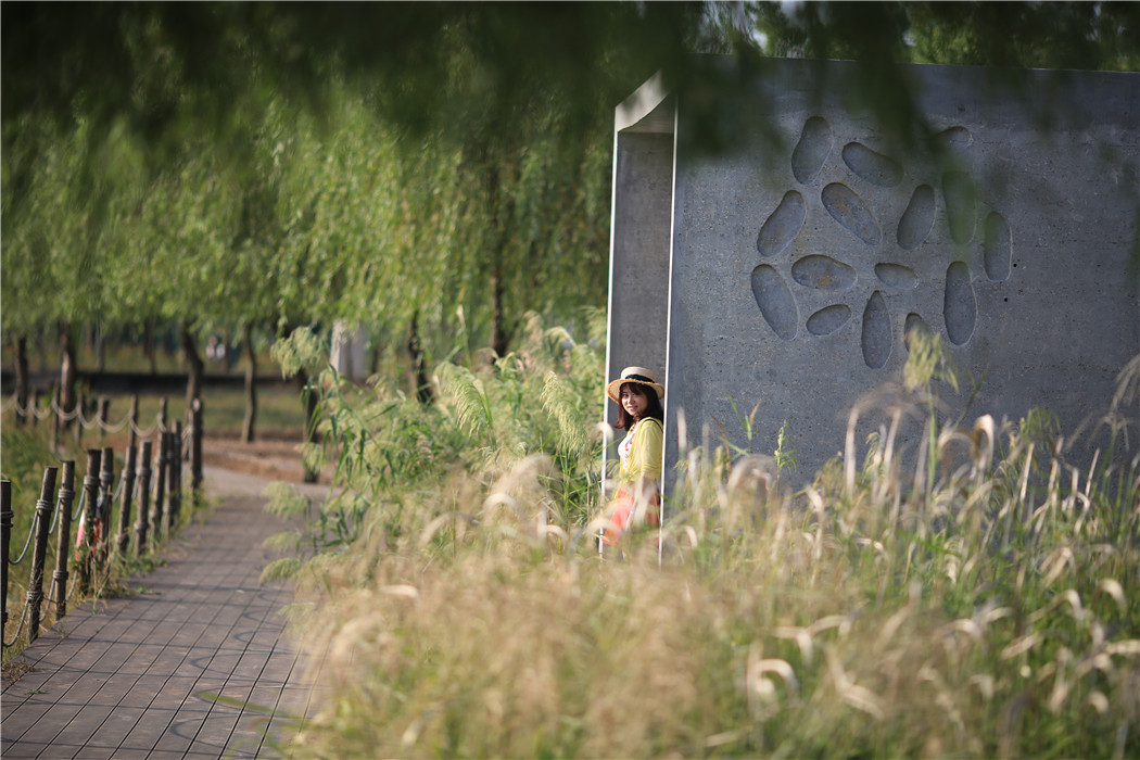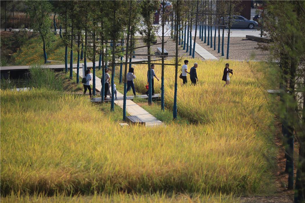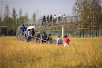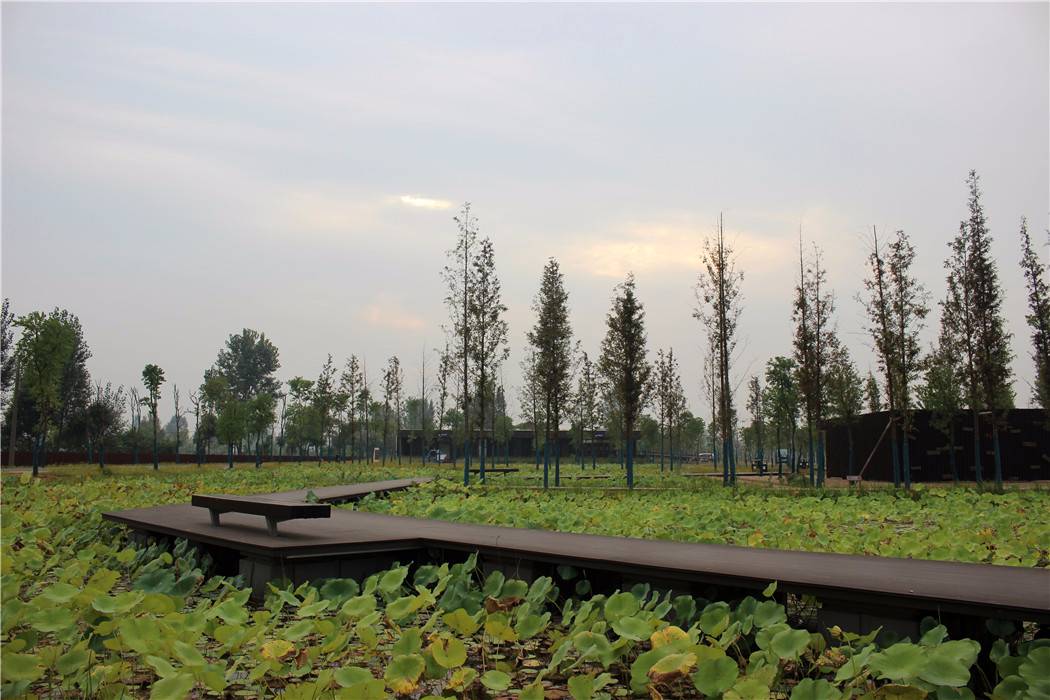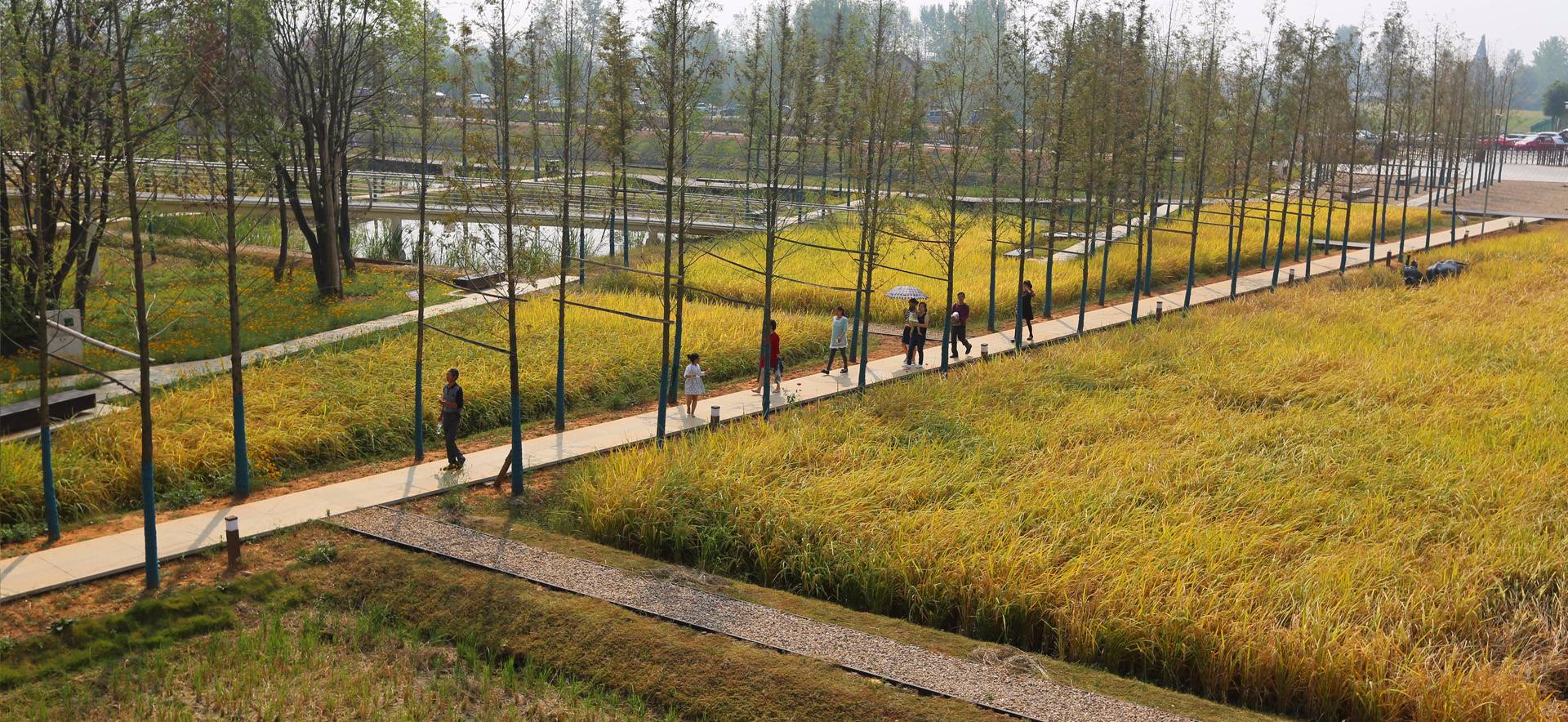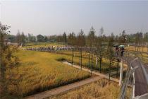 其次,用各種濕地植物及林帶,對環(huán)繞古城遺址的護城河外側水岸進行生態(tài)修復。核心區(qū)以外的公園的主體部分,被重新設計為農田,成為了一個戶外的稻田博物館。一年兩季、多品種的水稻在這里輪作;作為農田景觀的有機組成部分,水塘、水渠和濕地分布其中,生長著茂盛的鄉(xiāng)土植被,這些濕地和水系像海綿一樣,收集雨水,調節(jié)旱澇,同時吸收和過濾從稻田中流失的營養(yǎng)物質。精心設計的景觀紋理將戶外水稻博覽區(qū)與其他一般性的農田具有相似卻有不同的景觀,這些田塊肌理致密,田埂的朝向經過仔細的設計,形成多種微妙變換的透視角度。水杉林帶只沿著大致南北方向的田埂路種植,既能給田埂路遮蔽,同時又防止樹影投射在稻田里,因為這些稻田需要充足的日照來維持生長。夏日炎炎,綠蔭下的道路為游客提供了舒適駐留和漫步機會。