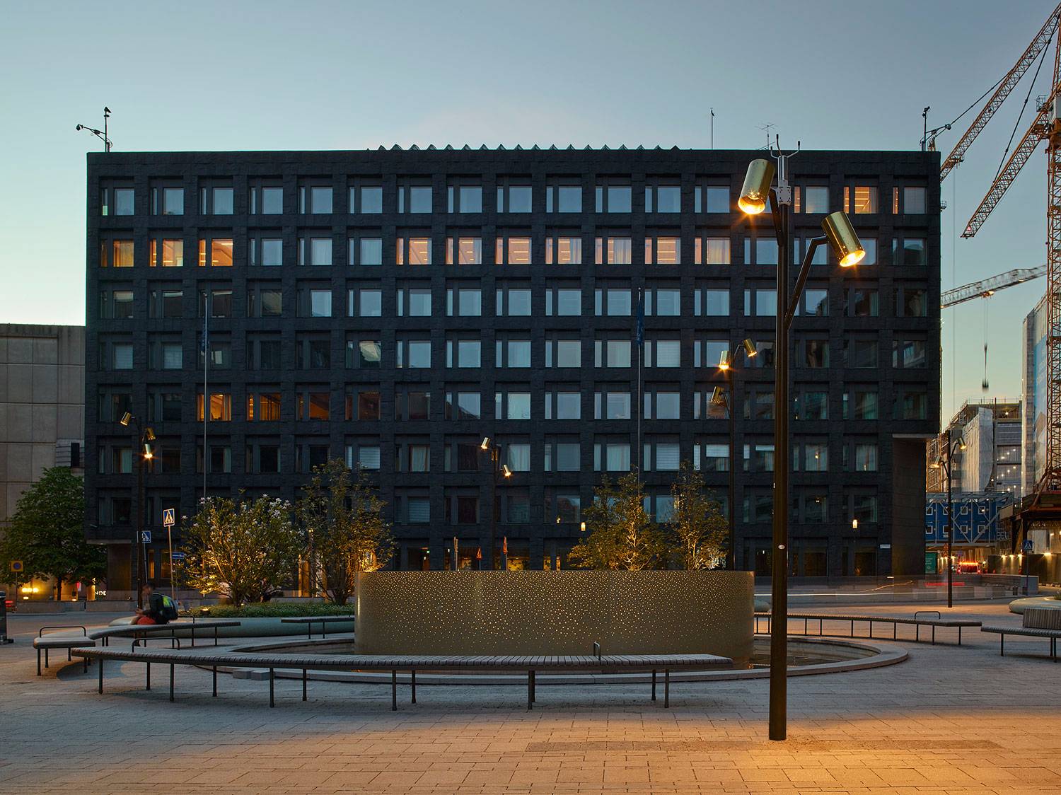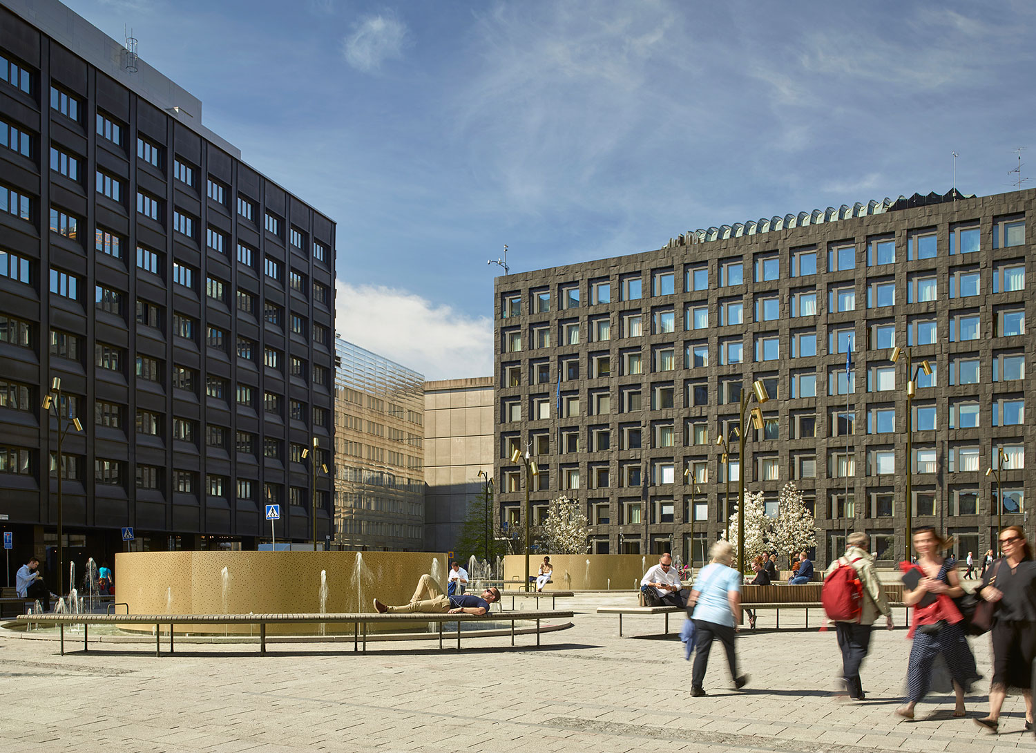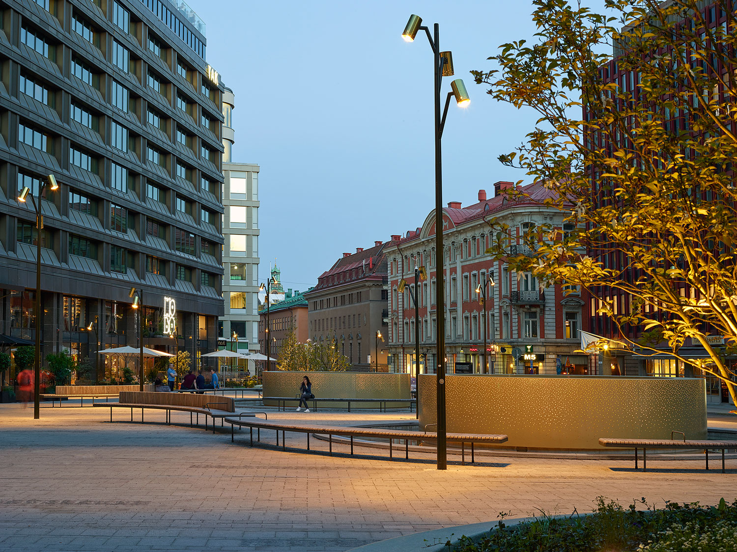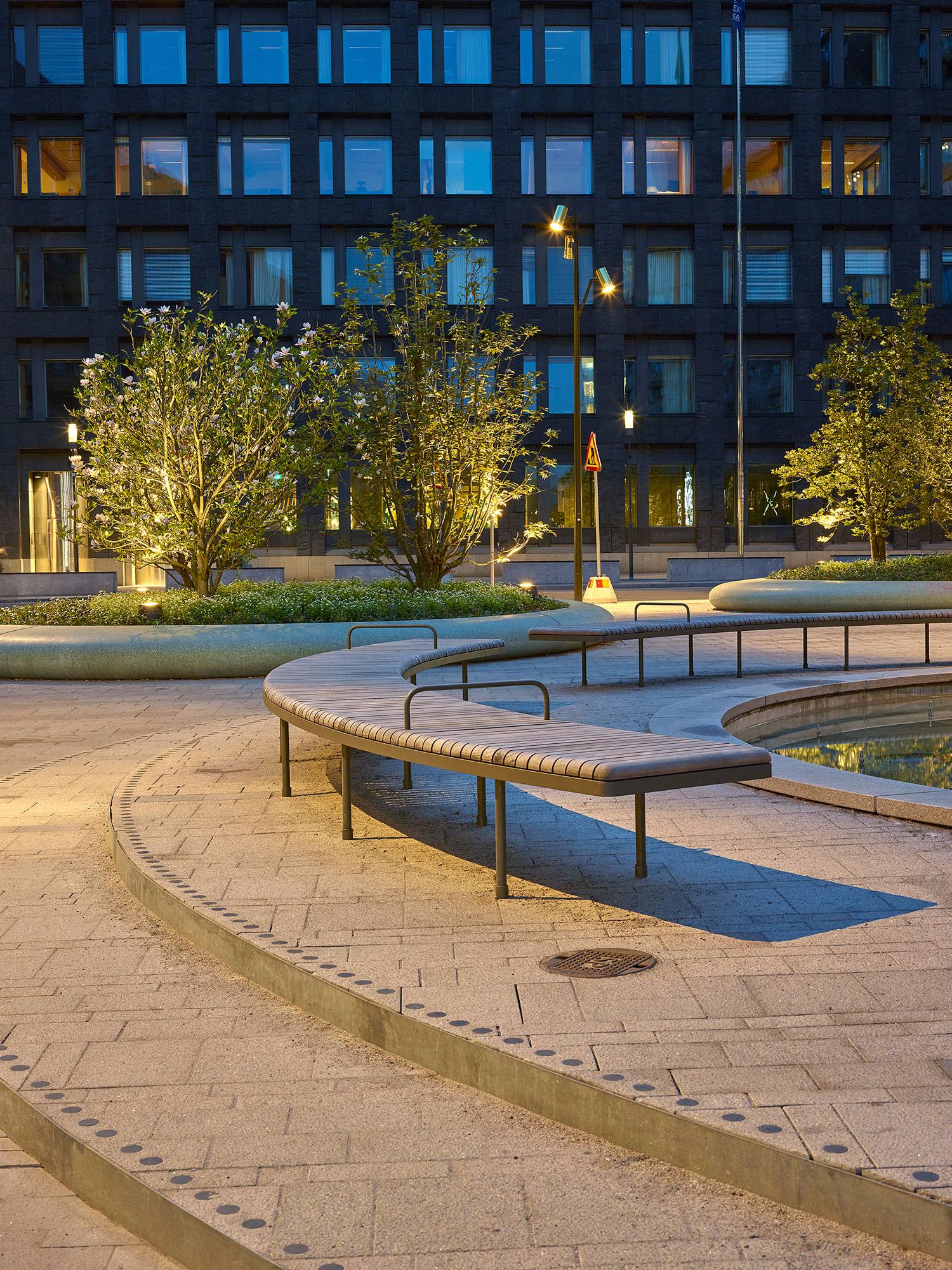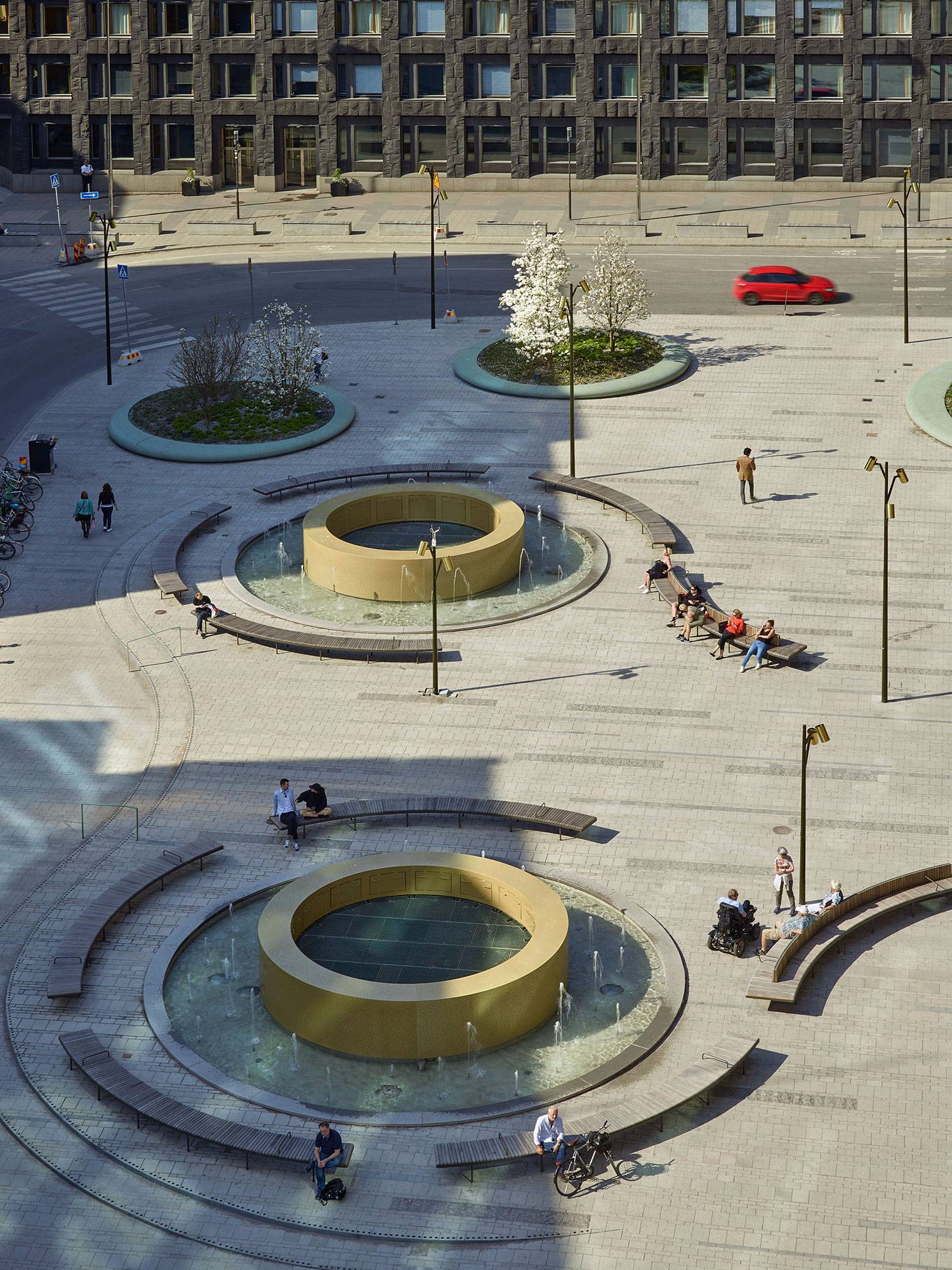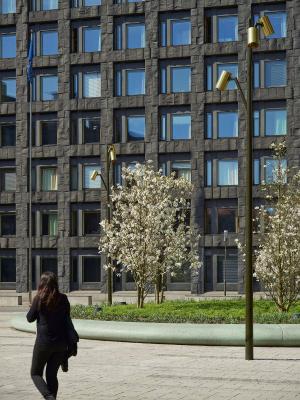 沿著Malmtorgsgatan,花崗巖鋪設(shè)繼續(xù)在寬闊的步行道上,木蘭站在街道兩側(cè)的大型混凝土花盆中。同樣的元素在廣場(chǎng)的北側(cè)返回,在中央銀行之外。