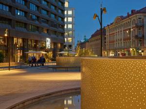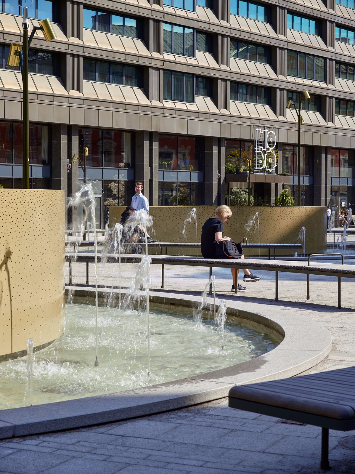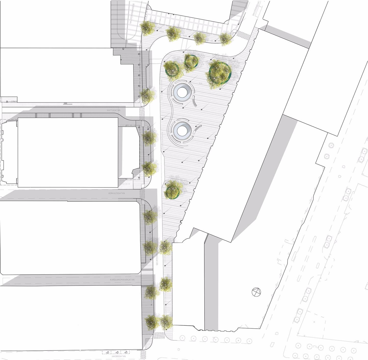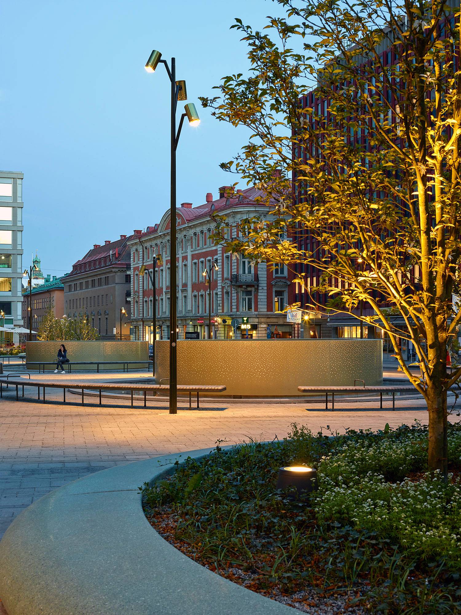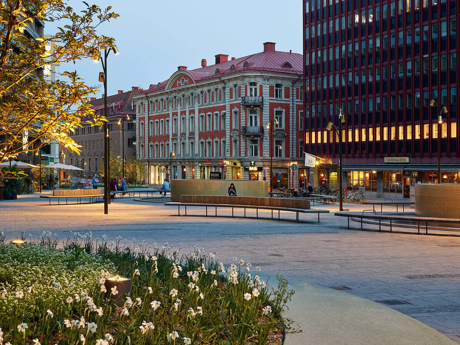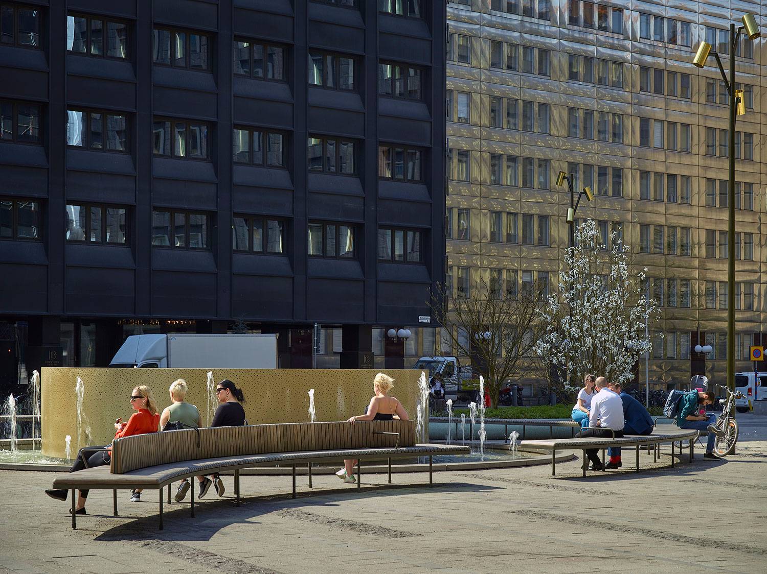 沿著Malmtorgsgatan,花崗巖鋪設(shè)繼續(xù)在寬闊的步行道上,木蘭站在街道兩側(cè)的大型混凝土花盆中。同樣的元素在廣場(chǎng)的北側(cè)返回,在中央銀行之外。