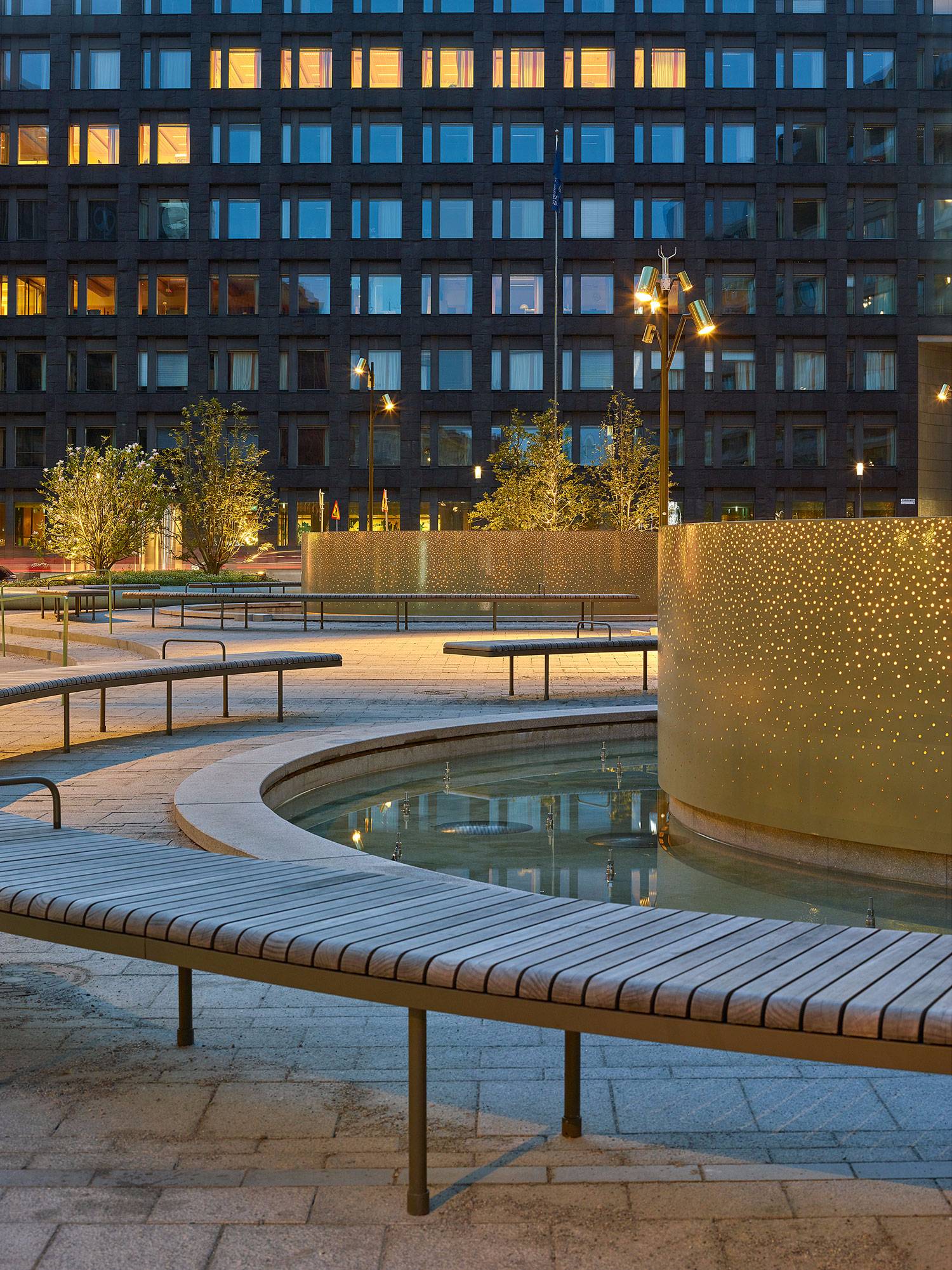 噴泉中的多孔鋼網(wǎng)在夜間充滿了閃爍的溫暖光線,同時(shí)還覆蓋了底層停車庫的通風(fēng)系統(tǒng)。