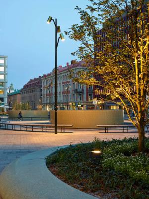 廣場(chǎng)上使用的所有材料都經(jīng)久耐用,提供優(yōu)雅和堅(jiān)固的體驗(yàn),與所選擇的設(shè)計(jì)語言相對(duì)應(yīng),與周圍的建筑形成鮮明對(duì)比,營(yíng)造出現(xiàn)代,俏皮和詩意的氛圍。