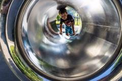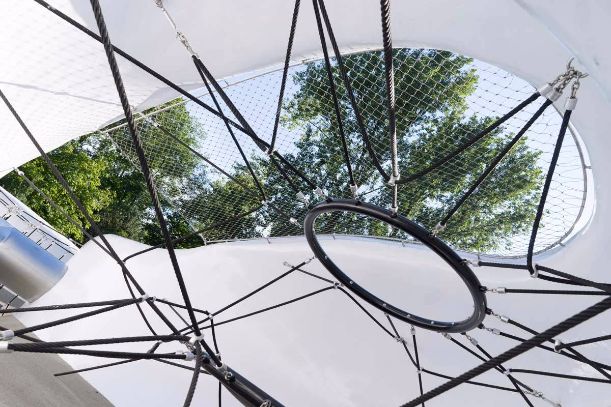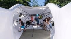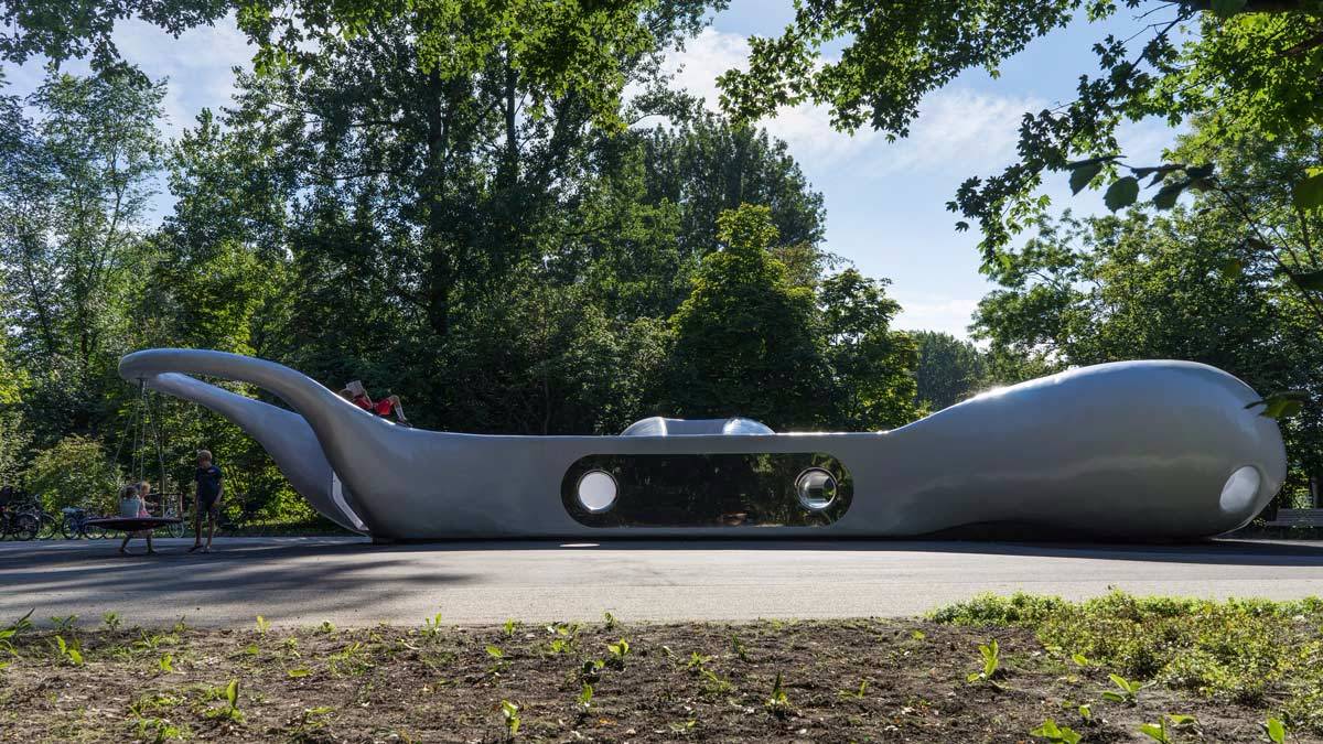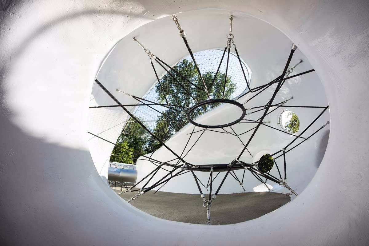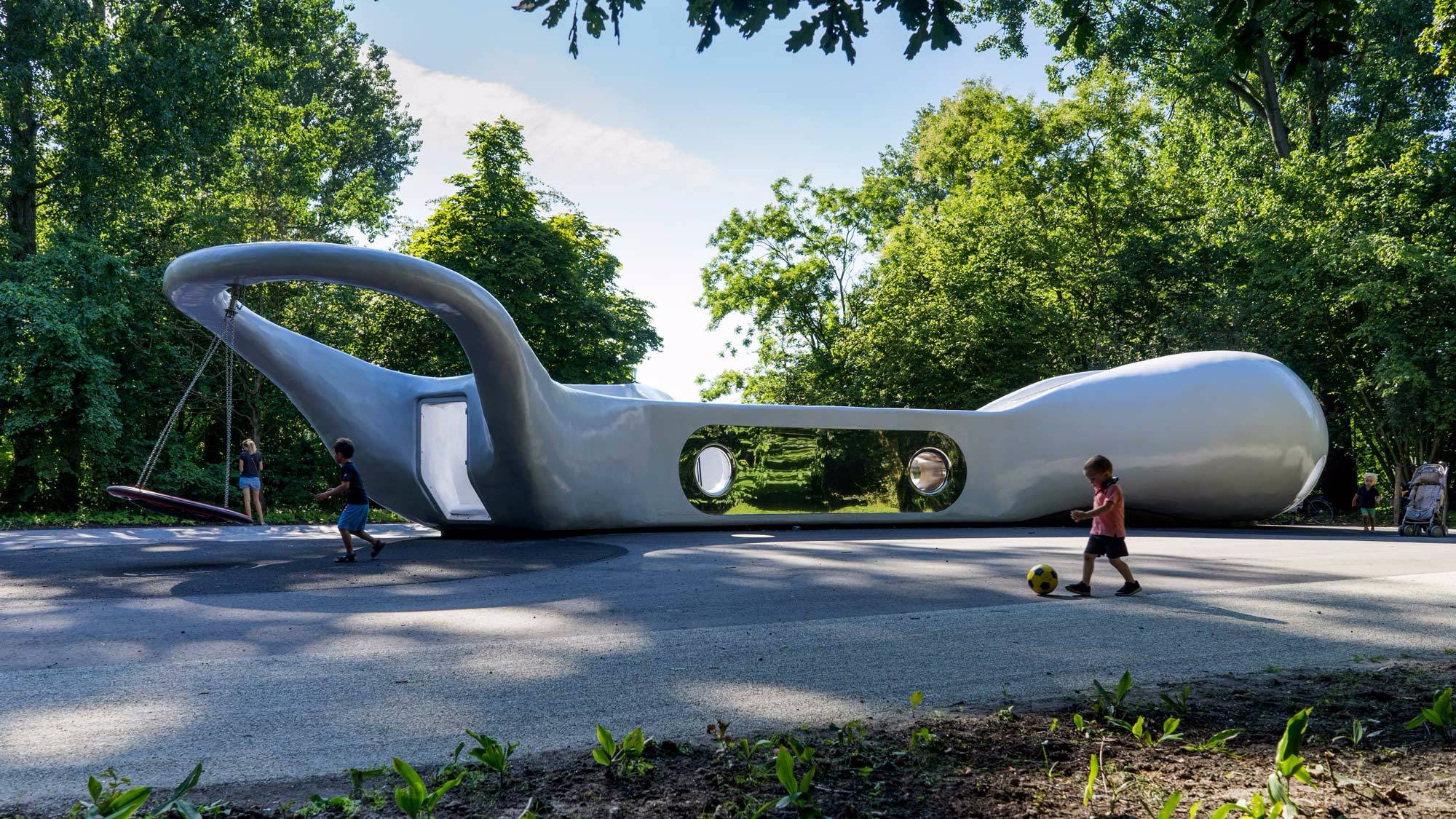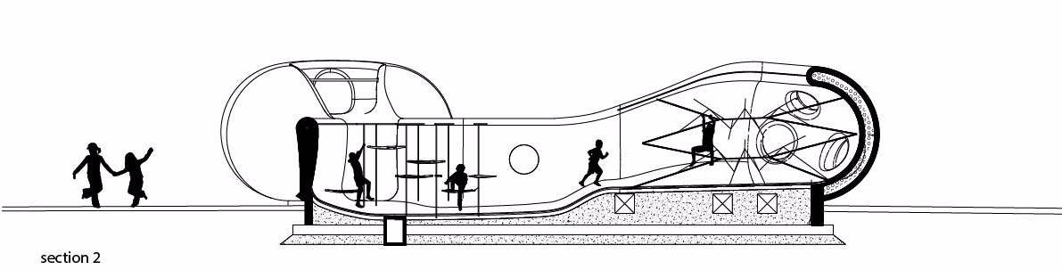 雕塑周圍的空間被分成三個,從而重新定義了環(huán)境。在雕塑內(nèi),孩子們可以攀爬,滑動和懸掛。因為這些游戲功能部分隱藏在內(nèi)部,所以兒童經(jīng)常會感到興奮。