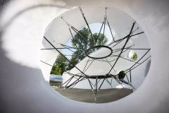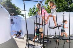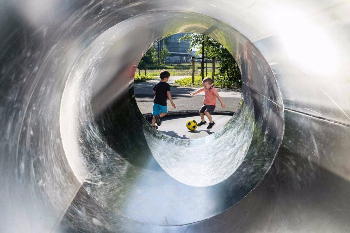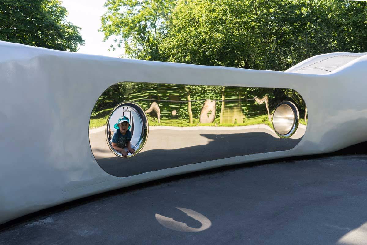 在游樂場的外面是一個鏡面墻,鏡面墻能夠映射周圍的景觀。在雕塑的一個外側(cè),蹦床沉入地下。另一方面,墻上畫了一個目標(biāo),從而將該區(qū)域擴展為比賽場地。