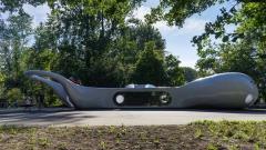 雕塑略微隱藏在樹木之間,但其形狀在兩側(cè)都是敞開的。明亮的淡紫色涂層使其在很遠的地方就能看到。