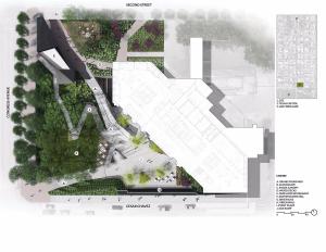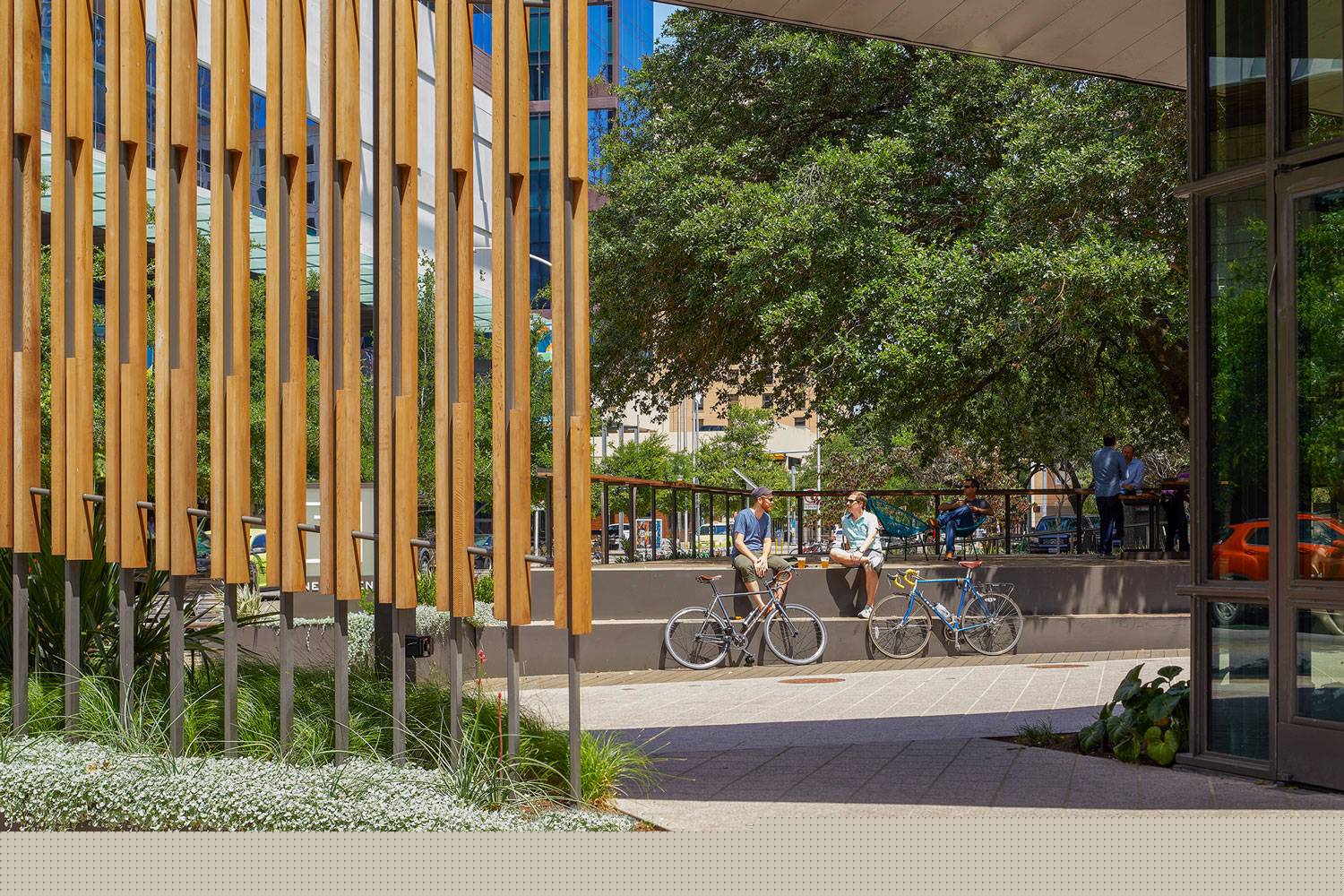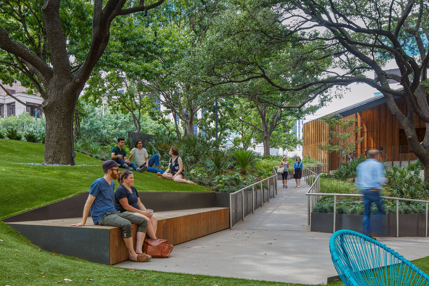 Fareground的廣場(chǎng)面積近1英畝,擁有迷人的滾動(dòng)草坪,生機(jī)勃勃的大橡樹(shù)。一個(gè)新的蜿蜒的ADA坡道連接整個(gè)空間,讓游客在進(jìn)入空間時(shí)沉浸在自然環(huán)境中,安靜地遮擋繁忙,阻擋相鄰的高檔街景的喧囂。