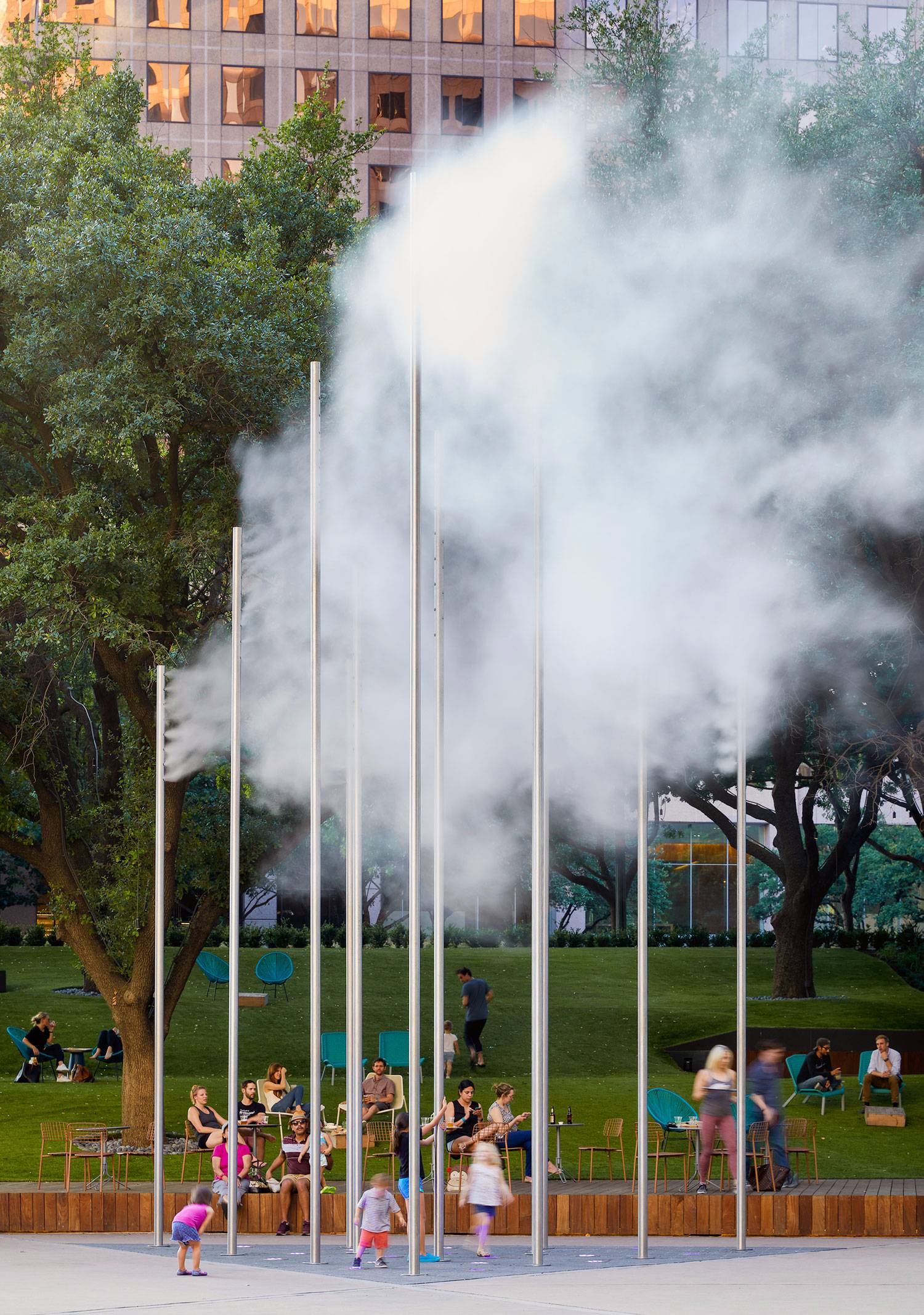 Cloudscape,F(xiàn)areground的標(biāo)志性水景,從建筑物的AC冷凝水中收集水,創(chuàng)造出強(qiáng)大的視覺(jué)燈塔。利用最先進(jìn)的技術(shù),水從十二個(gè)高大細(xì)長(zhǎng)的塔架上以令人難以置信的壓力霧化,創(chuàng)造出一種能夠展現(xiàn)光線,不透明度和運(yùn)動(dòng)質(zhì)量的雕塑。Cloudscape是該項(xiàng)目的互動(dòng)核心,包括可持續(xù)發(fā)展,公共藝術(shù),戲劇娛樂(lè),品牌推廣和創(chuàng)新尋路。
