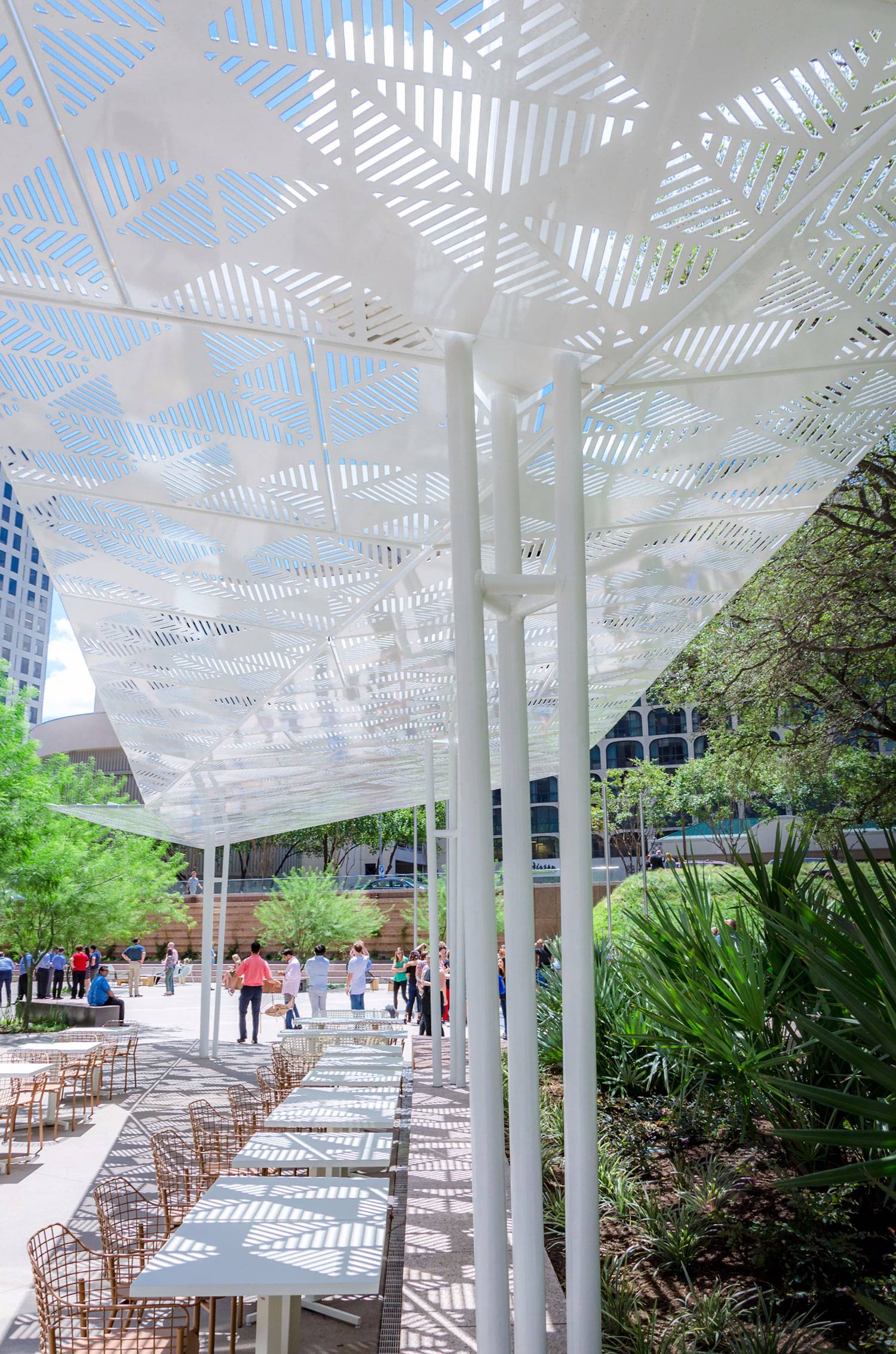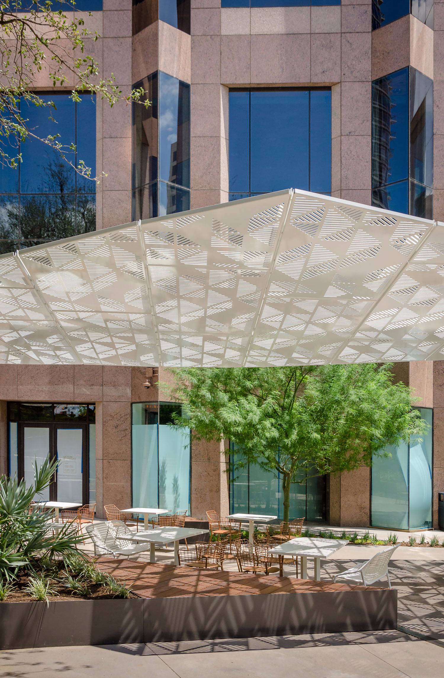Nimbus,定制設(shè)計(jì)和制造的遮陽(yáng)結(jié)構(gòu),與廣場(chǎng)地板相遇,可以減輕相鄰塔樓的暴露和巨大規(guī)模。當(dāng)云層穿過(guò)山谷時(shí),它們會(huì)響應(yīng)周圍的環(huán)境。反過(guò)來(lái),Nimbus折疊作為對(duì)場(chǎng)地角度地形的響應(yīng),而圖案化的頂篷創(chuàng)造出風(fēng)格化的斑駁光。