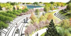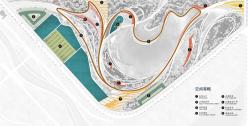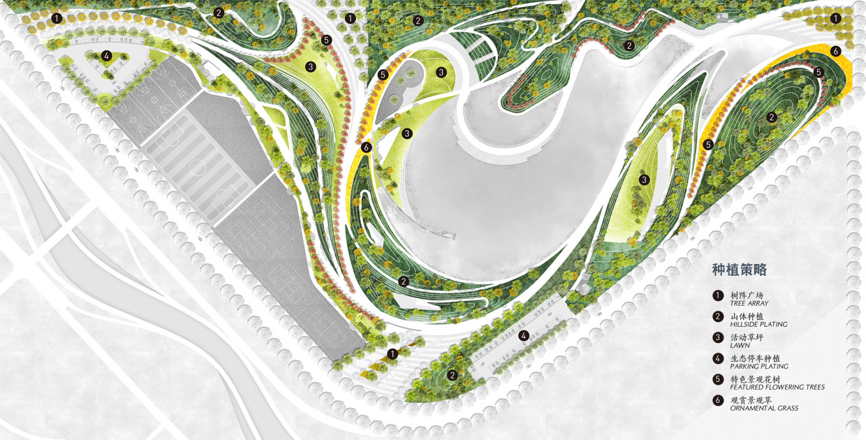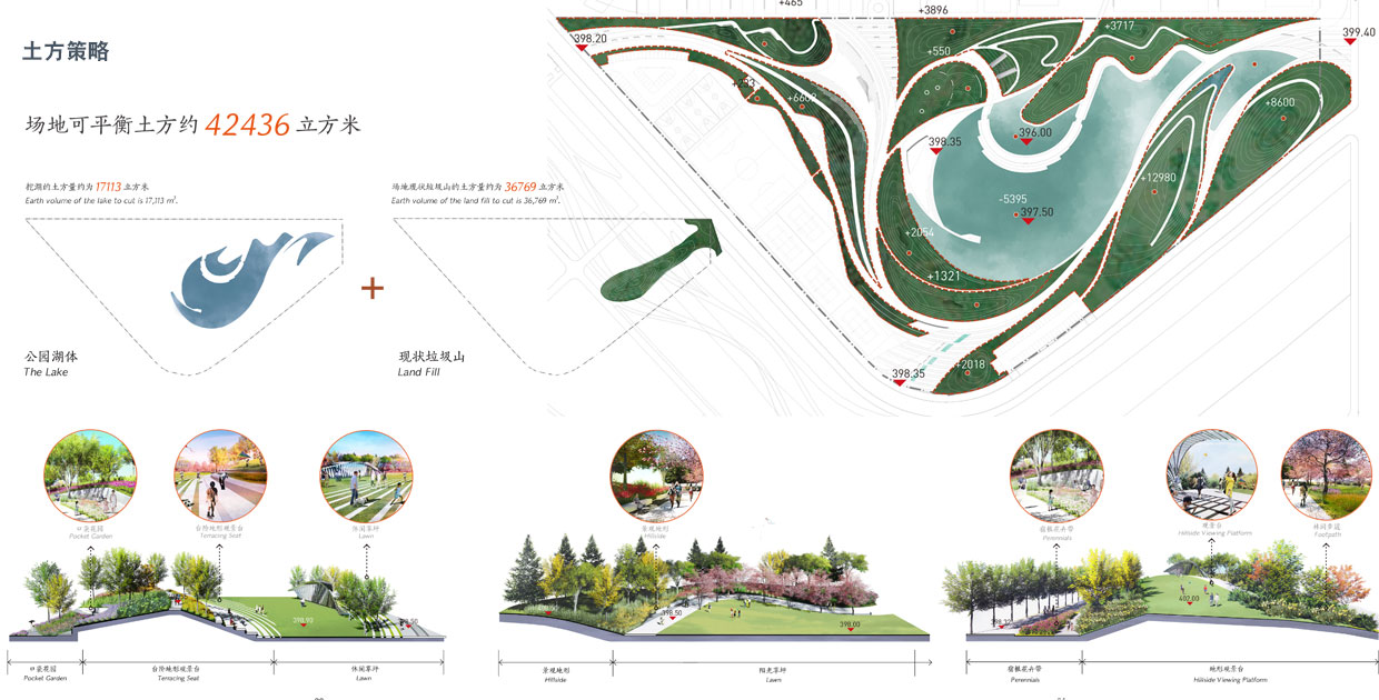 場(chǎng)地現(xiàn)狀垃圾山的土方量約為36700立方米,挖湖的土方量約為17100立方米,二者相加得到場(chǎng)地需解決的土方量為53800立方米。場(chǎng)地可平衡土方約:42500立方米,設(shè)計(jì)通過(guò)打散分散的方式,創(chuàng)造了豐富的圍合空間,同時(shí)基本實(shí)現(xiàn)了場(chǎng)地的土方平衡。