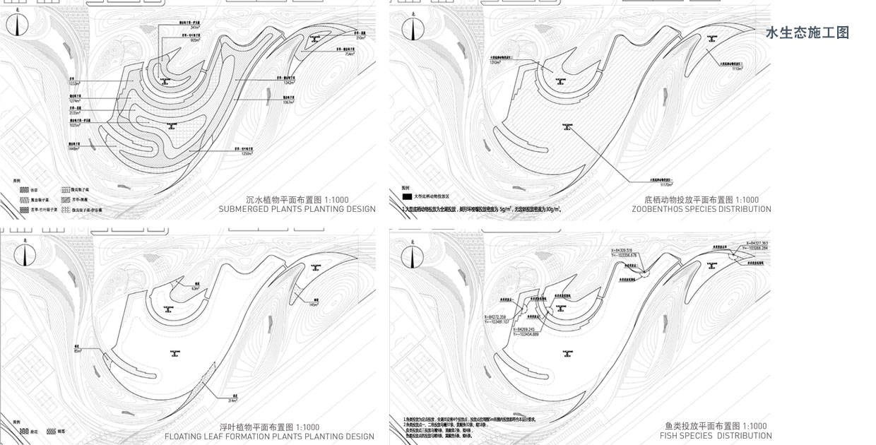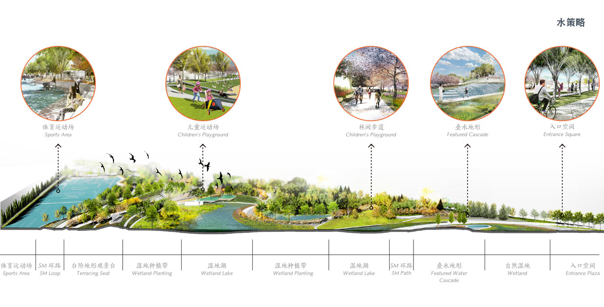 場(chǎng)地中的生態(tài)水景、景觀湖、灘涂濕地以及雨水花園通過(guò)綠廊連接形成整體。水源來(lái)自太平渠引水(近期),居住區(qū)生活污水(遠(yuǎn)期)凈化以及地表徑流。