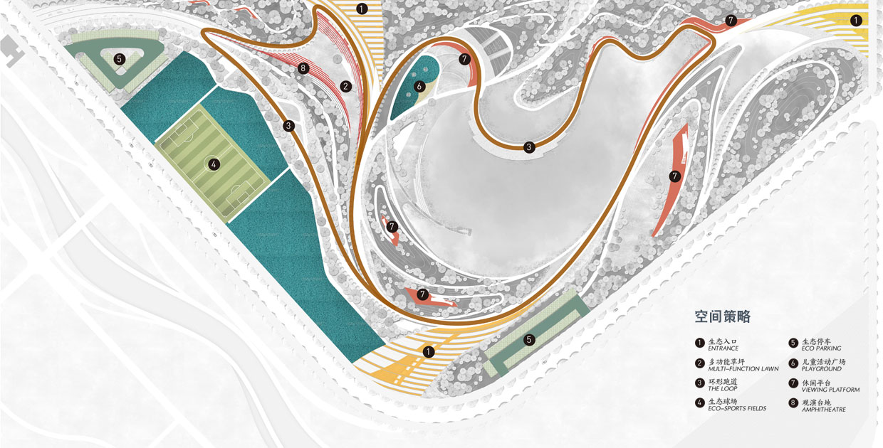 場(chǎng)地的慢行游憩系統(tǒng)采取大環(huán)+次級(jí)小環(huán)線配合盡端停留空間的組織方式。自行車道、跑步道、漫步道、生態(tài)探索小徑分合有序,創(chuàng)造出開合變換、張弛有度的多樣化空間體驗(yàn)。