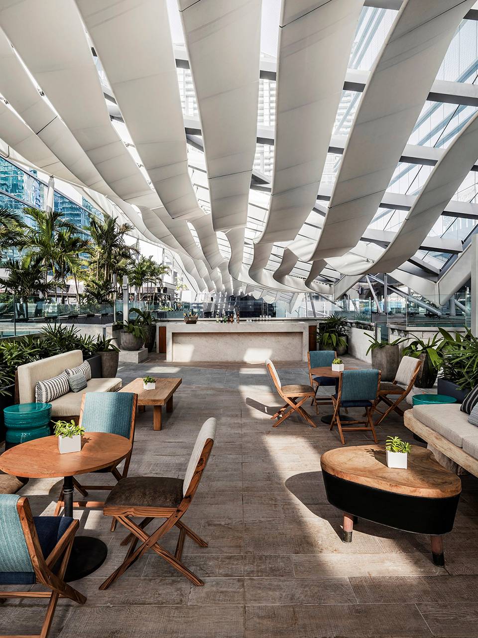 Billowy廣場(chǎng)的本土景觀旨在對(duì)大型綜合體的大膽幾何與建筑形式進(jìn)行強(qiáng)調(diào)和優(yōu)化。公共空間和住宅區(qū)的景觀結(jié)合了茂密的植被、幽靜的休息區(qū)和娛樂(lè)區(qū),以及充滿活力的餐飲區(qū)和集會(huì)場(chǎng)所。位于40層的空中酒廊上種滿了植物,可以阻擋大風(fēng)的侵襲,同時(shí)帶來(lái)若隱若現(xiàn)的天際線景觀。當(dāng)游客們?cè)诨⌒蔚幕ǔ睾妥慌远毫魰r(shí),將從隨風(fēng)搖擺的植物中間看到比斯坎灣的壯麗全景。