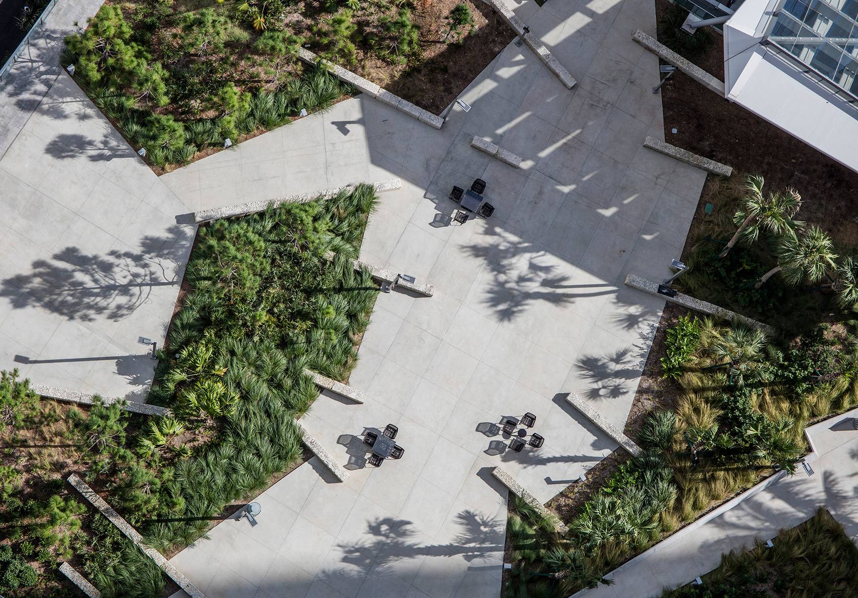 廣場(chǎng)裙樓的景觀包含了一系列特殊的本地植物群落,海濱沙丘、吊床和熱帶植物三個(gè)景觀帶分別代表了沙丘(Dune)、松林地(Pine Rockland)和泥灰草地( Marl Prairie)三種獨(dú)特的生態(tài)系統(tǒng)。該設(shè)計(jì)的重點(diǎn)在于建立真正意義上的植物群落,而非僅僅展示某個(gè)單獨(dú)的種類。連續(xù)而大規(guī)模的群落使植物能夠穩(wěn)固扎根并覆蓋水平層面,從而帶來(lái)更加多樣化且完整的活性土壤?;鶐r冠層、灌木和地被植物共同為景觀帶來(lái)天然而豐富的色彩。這些主要物種按照樹(shù)齡和大小被精確地安排在不同的位置,以模仿成熟天然植物群的生長(zhǎng)結(jié)構(gòu)。相比于當(dāng)下城市景觀中常見(jiàn)的對(duì)單一物種的大面積種植,Brickell中央廣場(chǎng)的景觀設(shè)計(jì)在每個(gè)植物群落中設(shè)置了廣泛的物種,最大程度地提高了物種多樣性,同時(shí)也為城市景觀中甚少被關(guān)注的物種共存的可行性問(wèn)題提供了一片實(shí)驗(yàn)田。