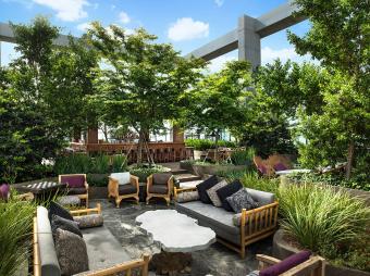 中央廣場(chǎng)9英畝的水平面積覆蓋了超過(guò)3個(gè)城市街區(qū),茂密的植物為整個(gè)廣場(chǎng)披上了一層生動(dòng)的綠色外衣,更有精致的硬景觀和清澈的池水穿插其間。從街道和廣場(chǎng)內(nèi)部的購(gòu)物區(qū)到住宅和酒店的休閑平臺(tái),從露天餐廳到40層高的空中酒廊,再到跨越了整個(gè)街區(qū)的空中橋梁,整體景觀設(shè)計(jì)涵蓋了包括辦公、住宅、酒店、零售和娛樂(lè)功能在內(nèi)的540萬(wàn)平方英尺的空間。