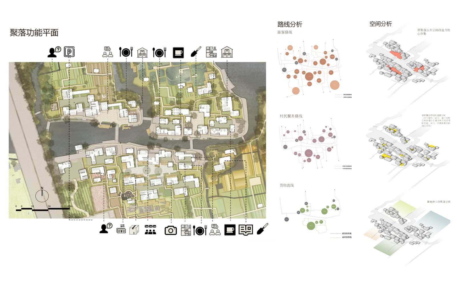 ▲ 聚落功能平面圖分析在聚落超市中的活動,同時分析其中游客、村民、貨物的流線,最后分析其中的空間改造策略。