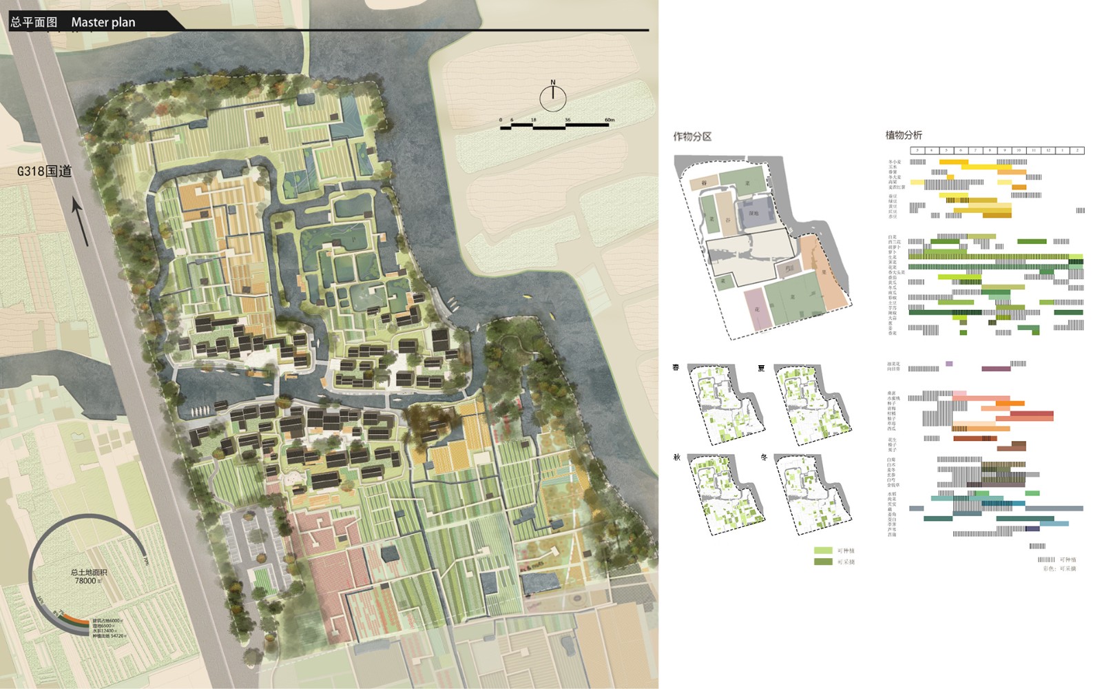 ▲ 總平面圖以及作物分區(qū),同時針對植物這一主要元素進行時間空間的分析,主要分析種植和采摘兩方面。