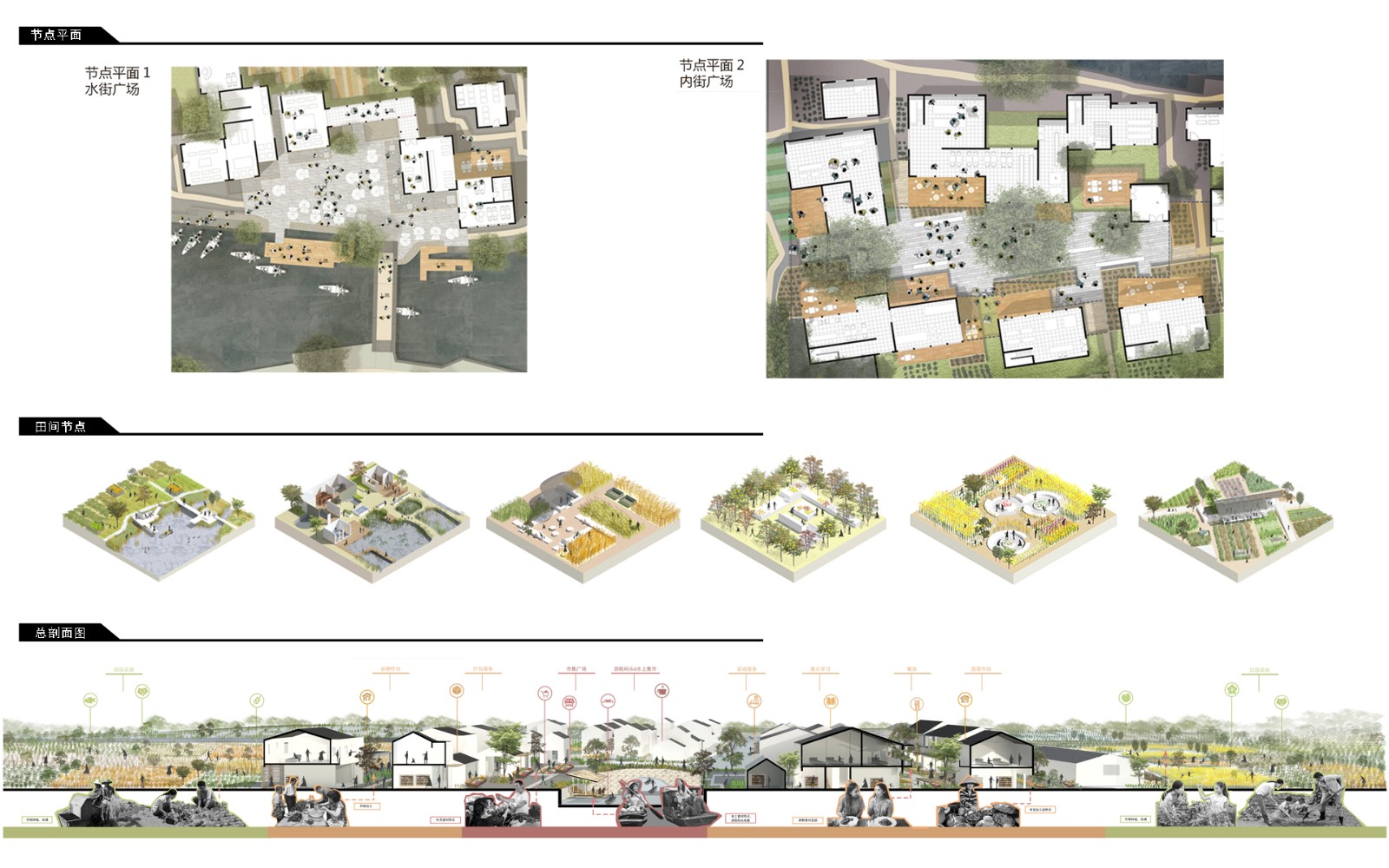 ▲ 兩個廣場節(jié)點表現(xiàn)聚落中的空間活動,六個田間節(jié)點表現(xiàn)田園中的空間活動,總剖面圖表現(xiàn)整個田園超市結(jié)構(gòu)和氛圍。