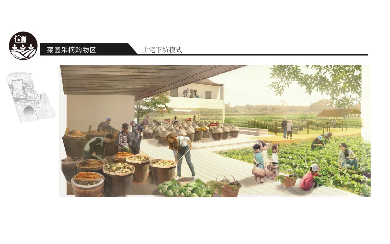 ▲ 菜園采摘購物區(qū)的效果圖,主要表現(xiàn)上宅下坊的傳統(tǒng)結(jié)構(gòu)延續(xù),和菜園作坊中的活動與景致。