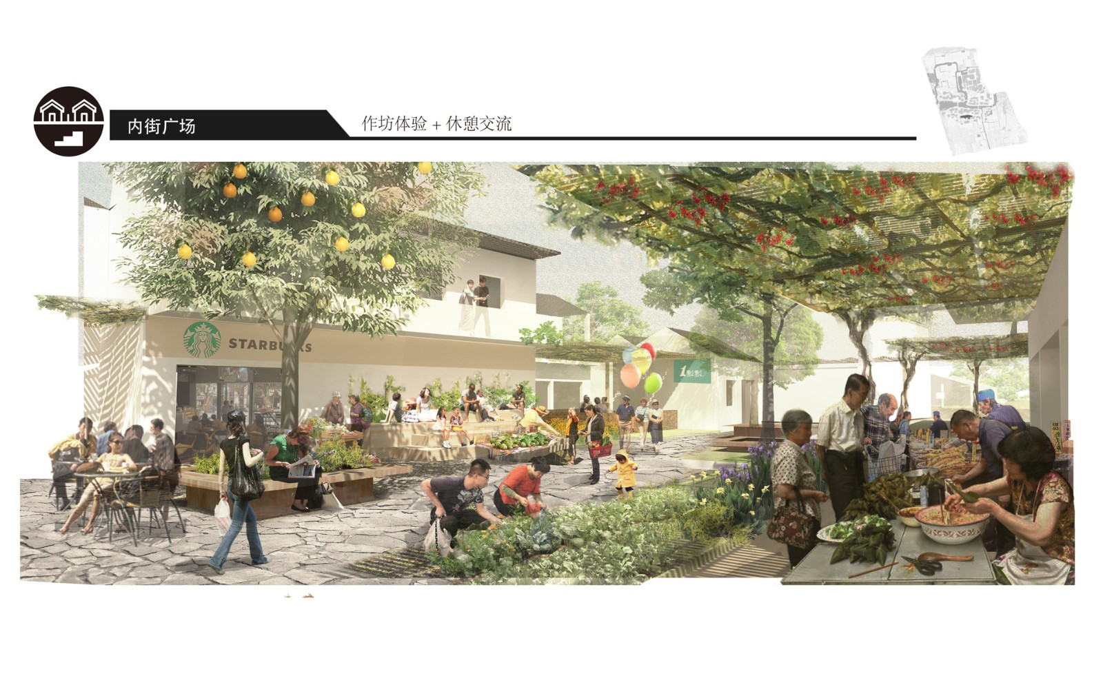 ▲ 內(nèi)街廣場的效果圖,改造利用場地原有聚落中空地,結(jié)合兩側(cè)作坊,設(shè)置半室內(nèi)空間供市民和村民休閑、交流和購物。